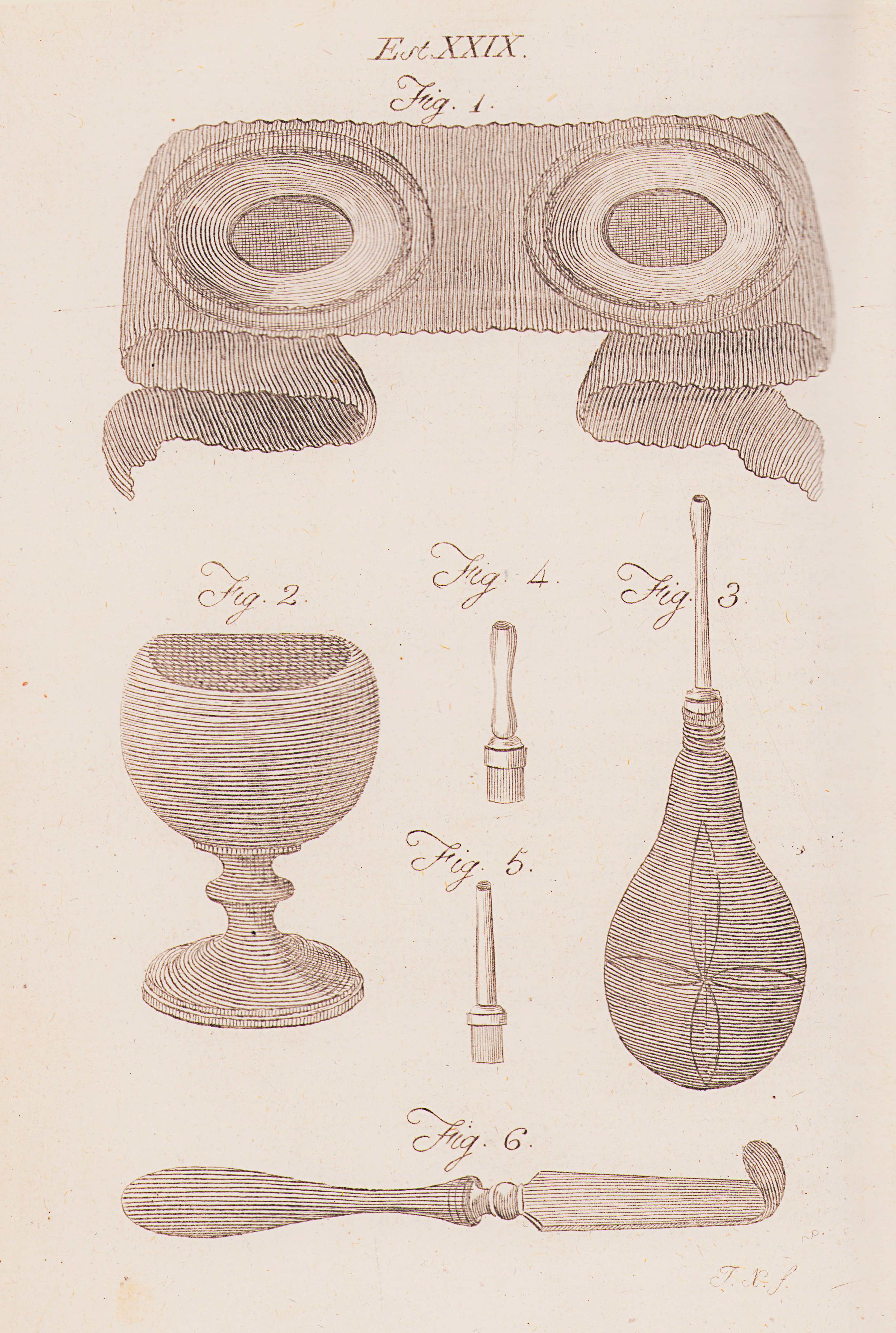 Lámina 29:Figura 1: Vendaje para los ojos con el que recibe el enfermo la cantidad de luz que puede desear.Figura 2: Copa oval para bañar los ojos en agua u otro fluido. Figura 3: Squito de resina elástica adaptado a un tubo de marfíl para inyectar el agua caliente entre los párpados y el globo del ojo. Figura 4 y 5: Tubos de diferentes formas que se adapta según la necesidad a uno de estos sacos.Figura 6: Garfio plano de plata o acero bruñido para separar los párpados uno de otro.