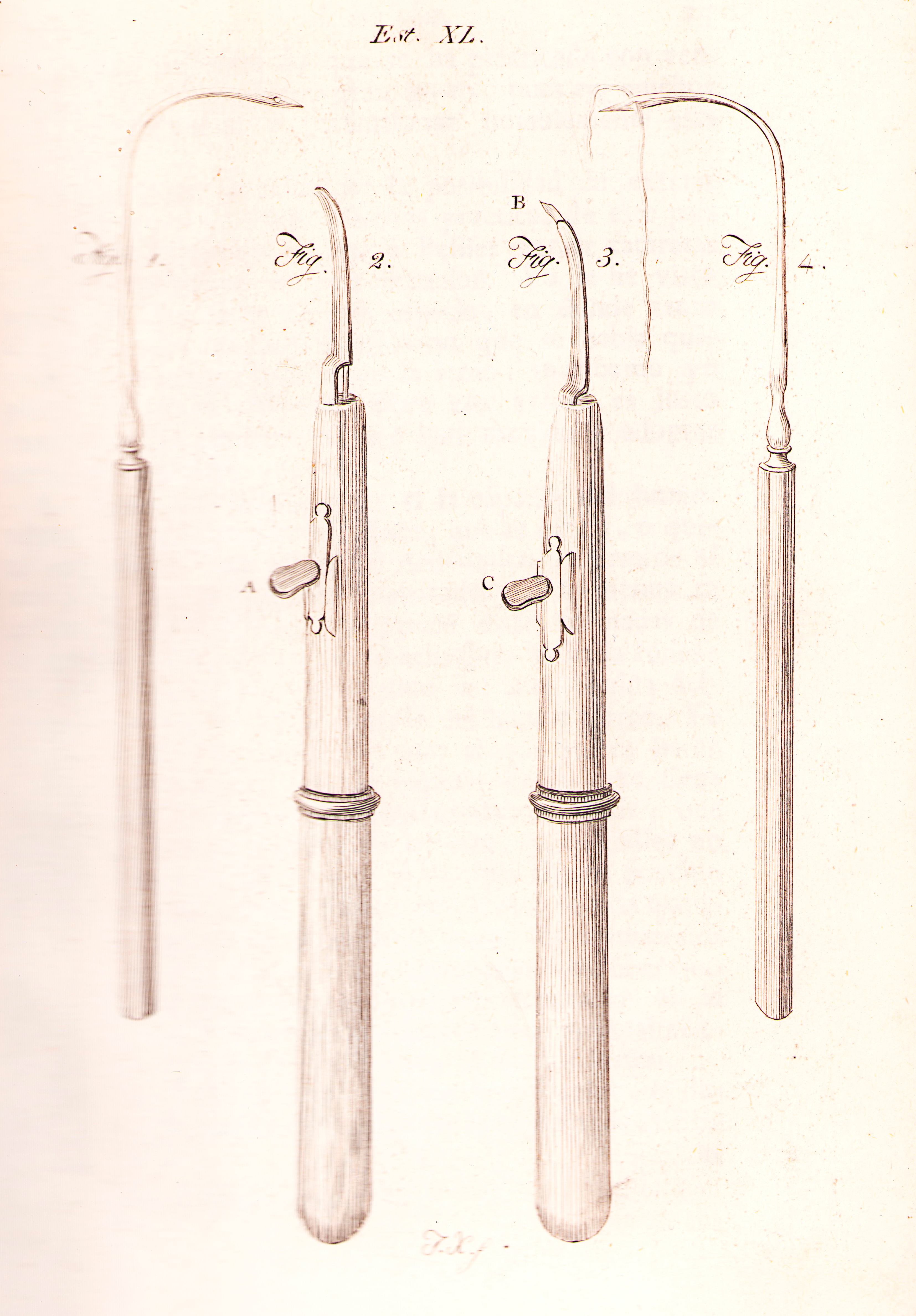 Lámina 40:Figura 1: Aguja curva fijada en un mango para pasar las ligaduras por debajo del Ptberigium. Figuras 2 y 3: Instrumento que Pellier llama crystotomo para abiri la lente de la cápsula cristalina.