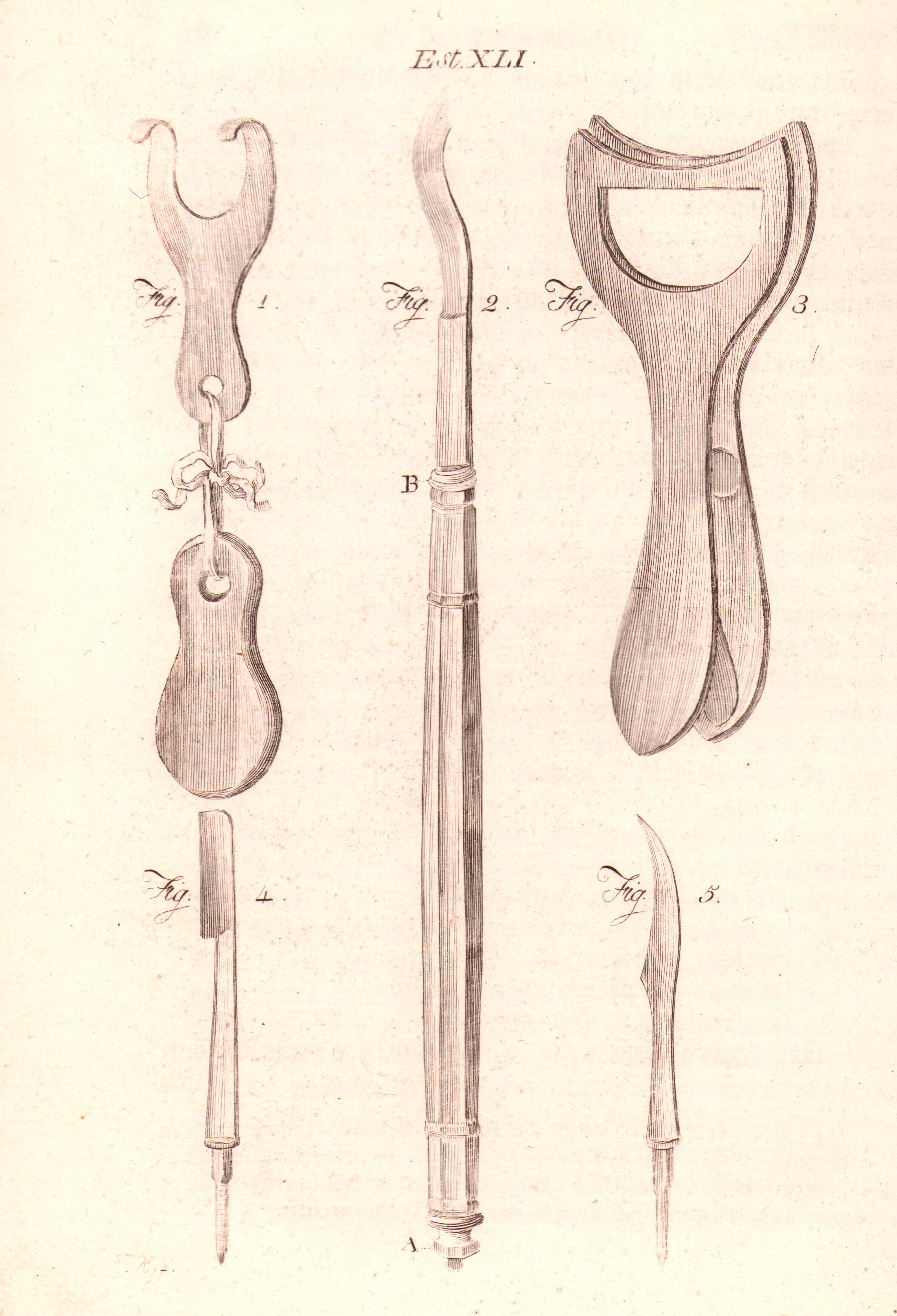 Lámina 41:Figura 1: Instrumento para deprimir el párpado inferior.Figura 2: Cuchillo que emplea Pellier en algunos casos para la extrracción de la catarata.Figura 4 y 5: Distintos cuchillos.Figura 3: Instrumento para determinar la porción de cutis que se debe quitar en la operacion del trichiasis o inversión de los párpados.Figura 4: Cuchillo para abrir los abscesos pequeños.Figura 5: Cuchillo con punta cortante para dividir los vasos del ojo o de los párpados.