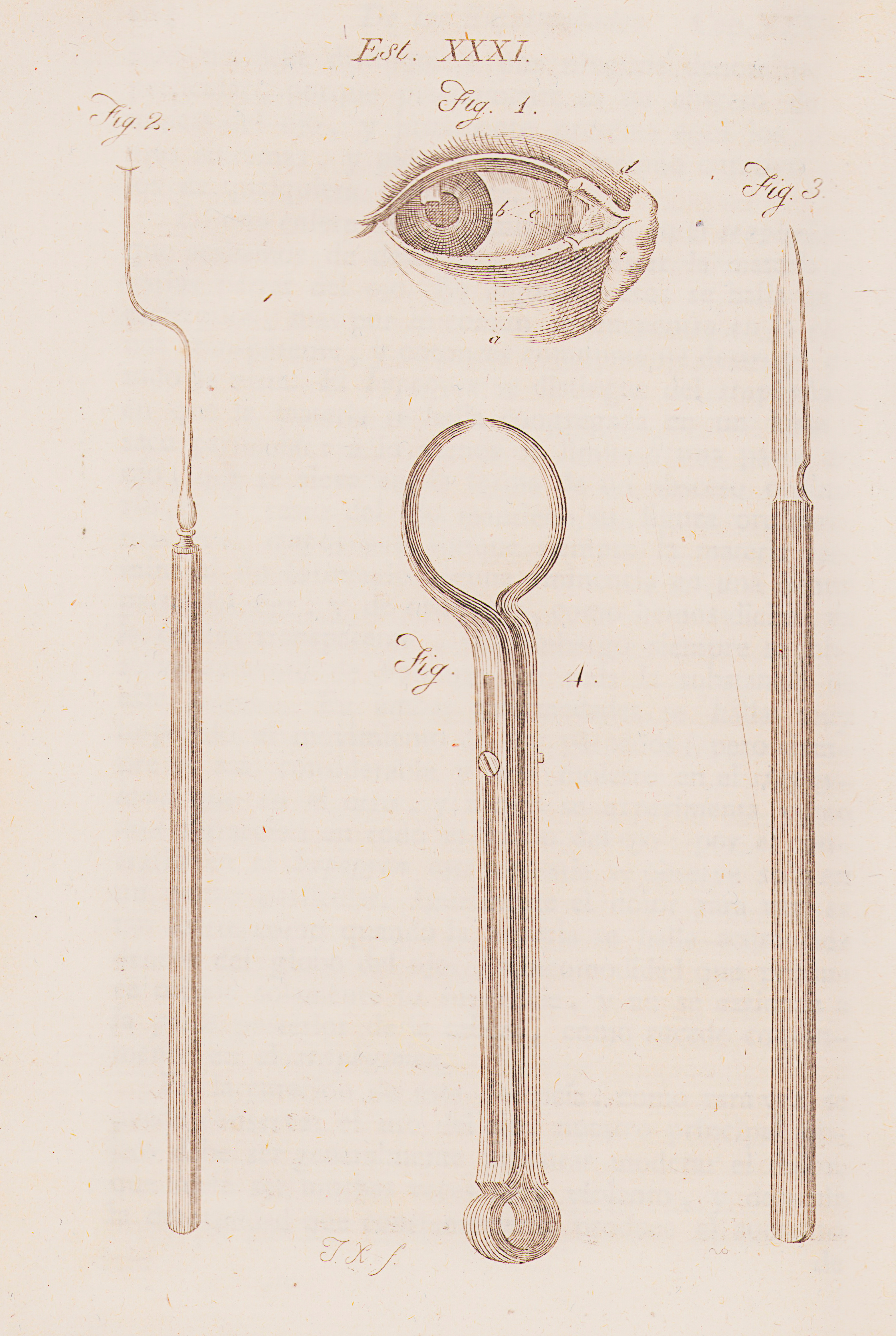 Grabado perteneciente al libro “Sisitema o curso completo de cirugia por el célebre Benjamin Bell” Tomo 3. Enfermedades del cerebro producidas por causa externa, y enfermedades de los ojos.