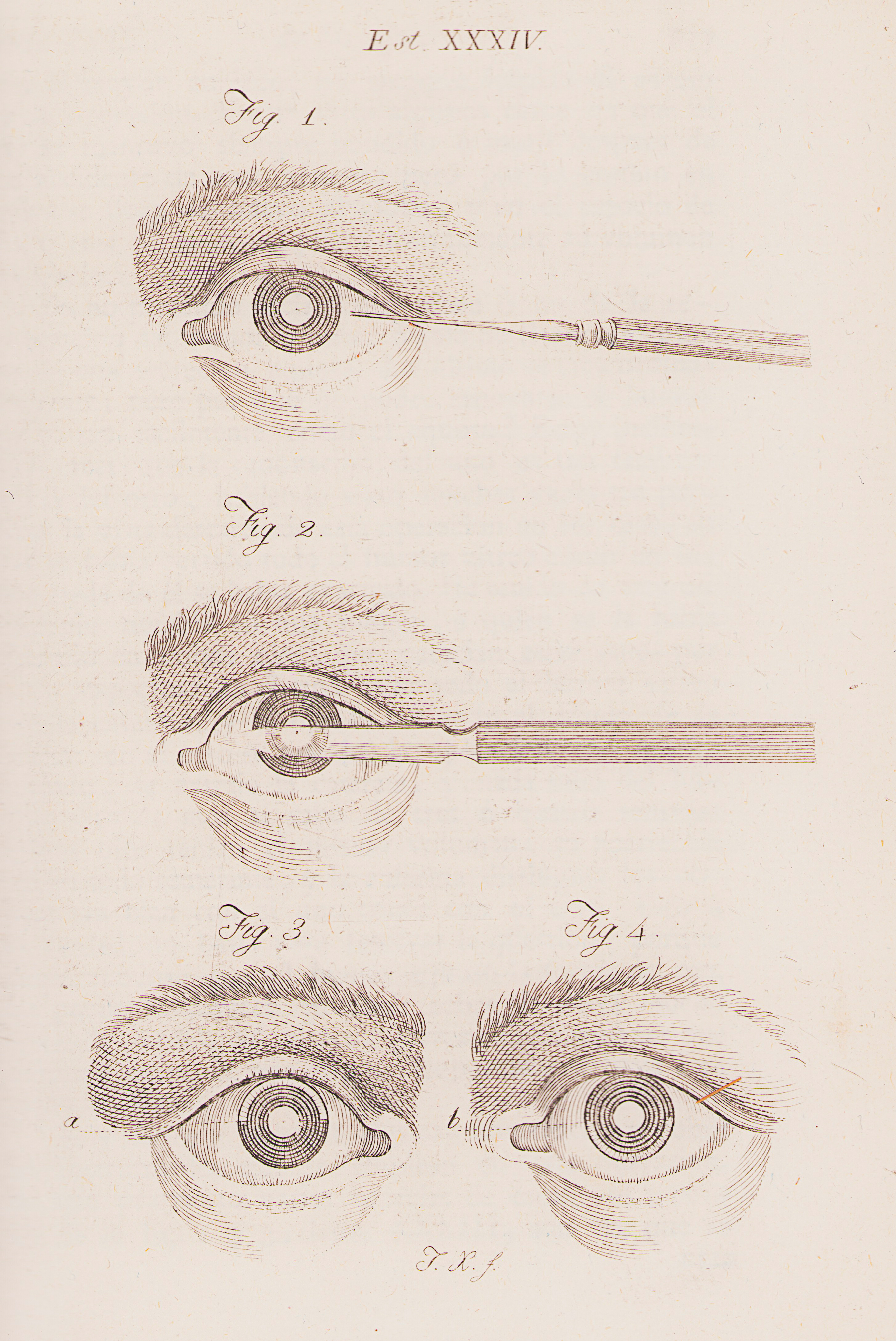 Lámina 34: Figura 1: Aguja de abatir en ojo. Figura 2: El escapelo empleado para dividir la córnea en la extracción de la catarata.Figura 3: Córnea dividida.