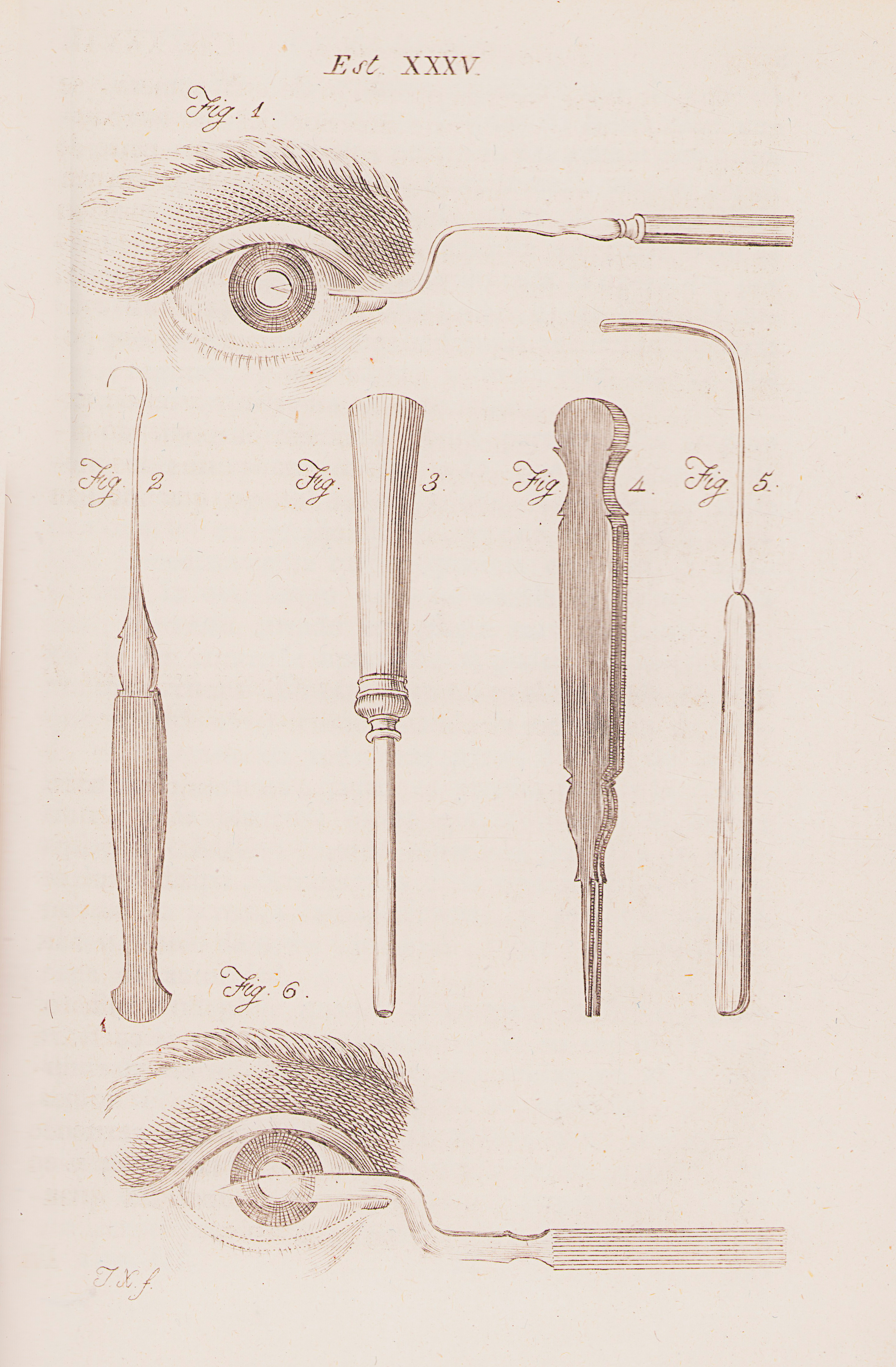 Lámina 35:Figura 1: Abatir la catarata con el ojo derecho y mano derecha gracias al escapelo curvo. Figura 2: Tienta curva puntiaguda para el esalojo de la catarata.Figura 3: Tubo de acero con borde cortante para penetrar un hueso duro en la operacion de la fistula lagrimal.Figura 4: Tenacillas o pinzas. Figura 5: Tienta curva y plana que se introduce en la puplila para abrir la cápsula de la lente, y que pueda salir la catarata. Figura 6: Escapelo curvo introducido por debajo de la córnea.