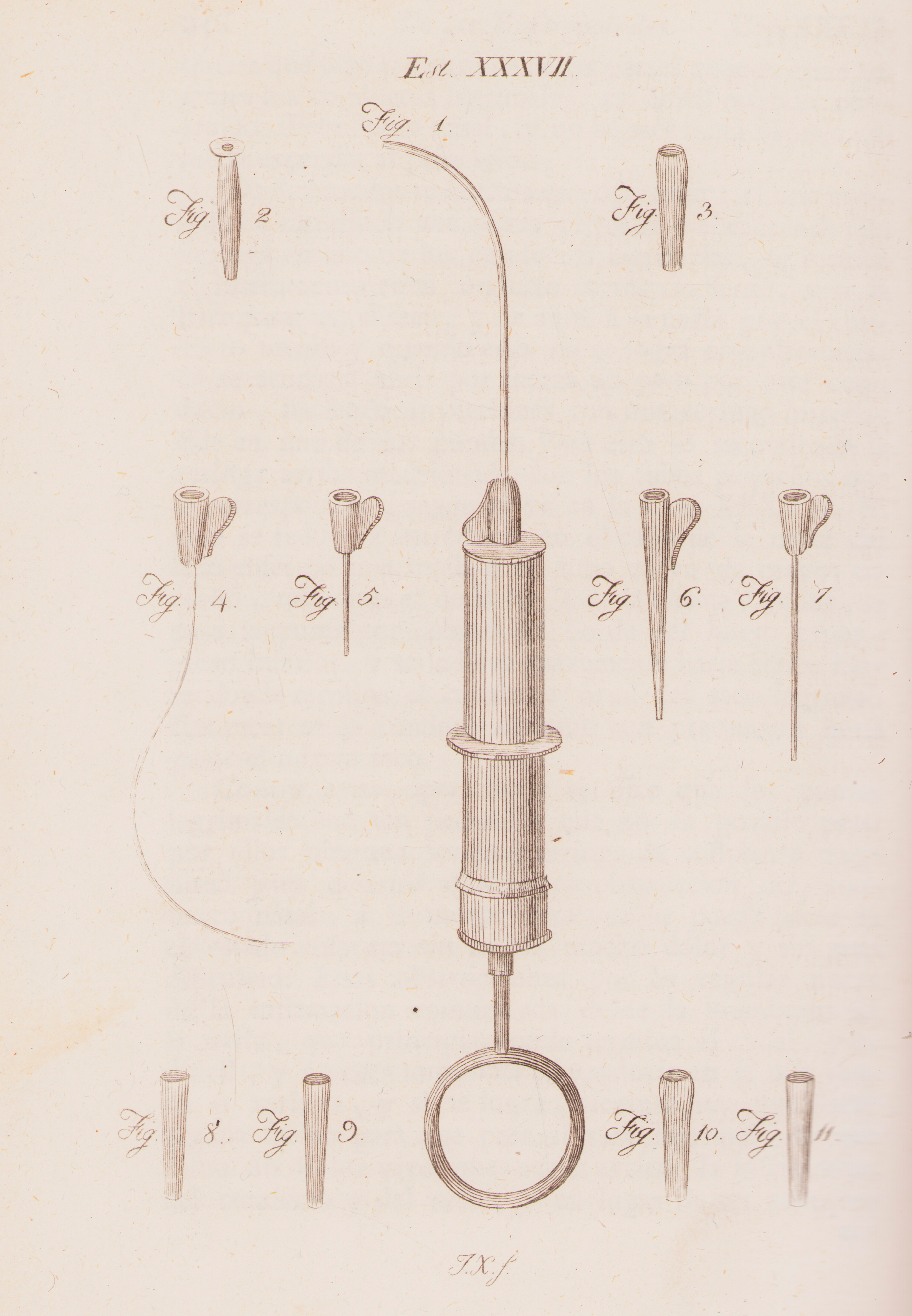 Lámina 37: Figura 1: Jeringuilla de plata para inyectar líquidos en los conductos lagrimales. Las demás figuras representan tubos adaptadoas a la jeringuilla.