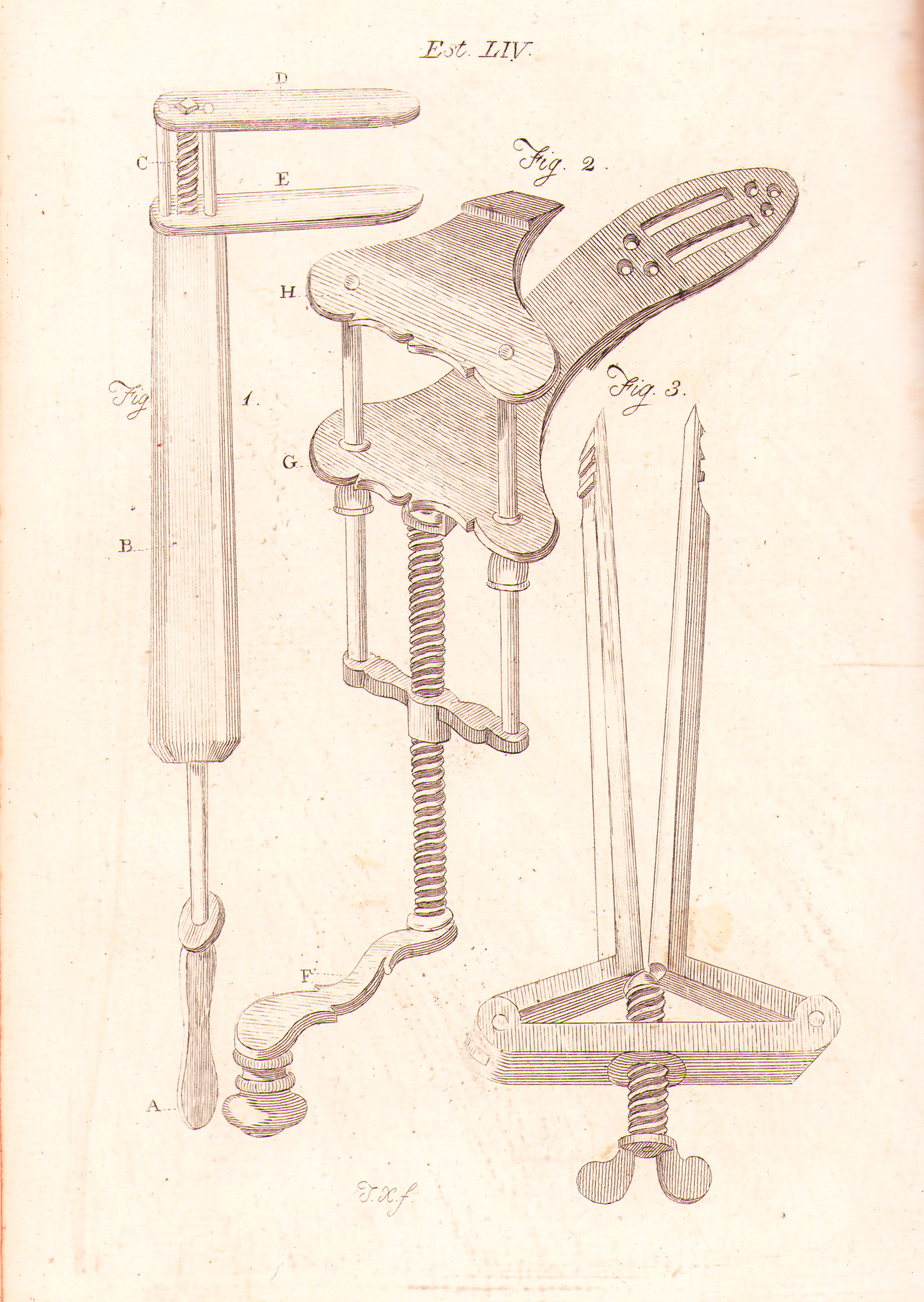 Lámina 54: Figura 1: Spéculum oris que propuso Benjamin Bell.Figura 2: Otra forma de spéculum para boca. Figura 3: el instrumento que comunmente se usa como spéculum oris.