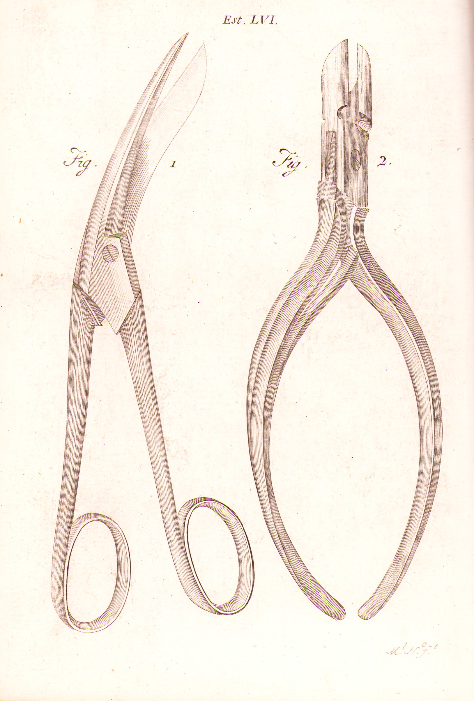 Lámina 56: Figura 1: Tijeras para dividir el labio leporino. Figura 2: Tenacillas cortantes para quitar las esquirlas pequeñas del hueso en donde quiera que se hallen.
