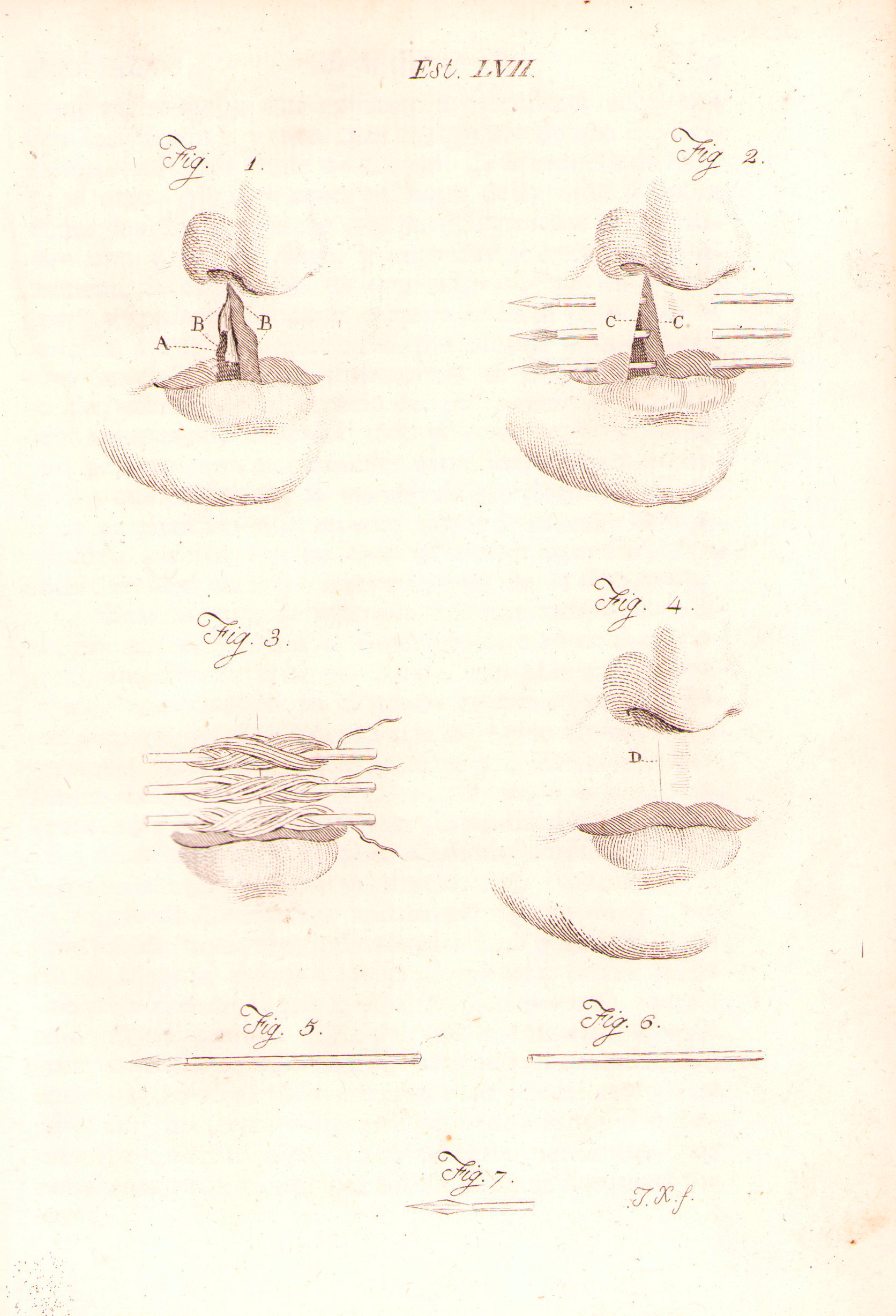 Lámina 57: Figura1 :Labio leporino en el labio superior.Figura 2: Aspecto que presentan las partes despues de que han quitado los bordes de la fisura y se han introducido los alfileres. Figura 4:Estado del labio después de que se ha completado la curación.Figura 5: Alfiler plano para la operación del labio leporino. Ale alfiler fig.6 debe ser de oro y la punta fig. 7 de acero.
