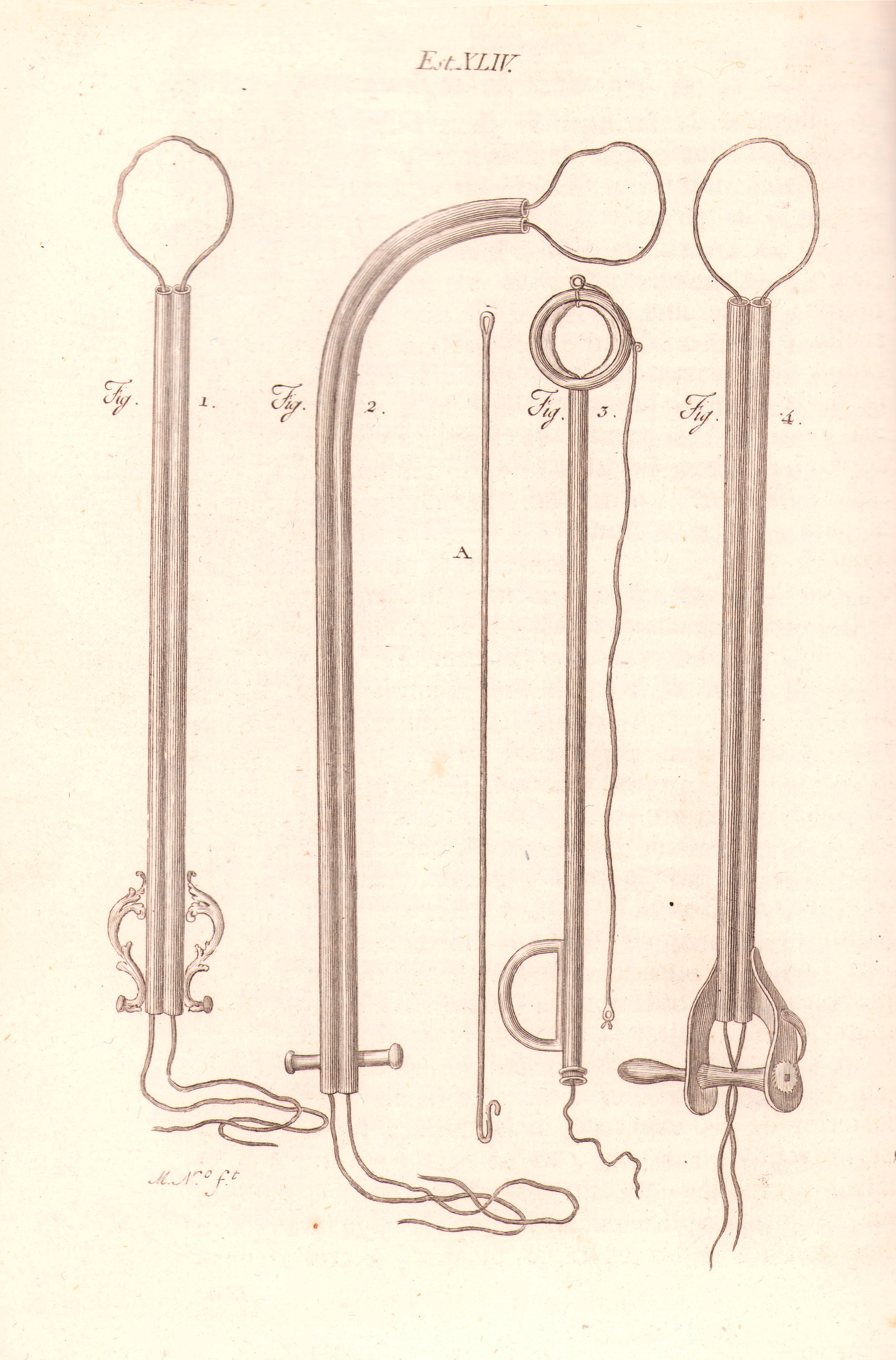 Lámina 44: Figura 1: Cánula doble para fijar lar ligaduras sobre las excresencias poliposas de a nariz, garganta, oidos o vagina. Figura 4: Cánula para el mismo fin paero con diferente construcción. Figura 2: Cánula de la misma especie de las otras, pero por ser curva la hace más adecuada para quitar lo pólipos que estan profundamente situados en la garganta. Figura 3: Instrumento para pasar una ligadura sobre la úvula.