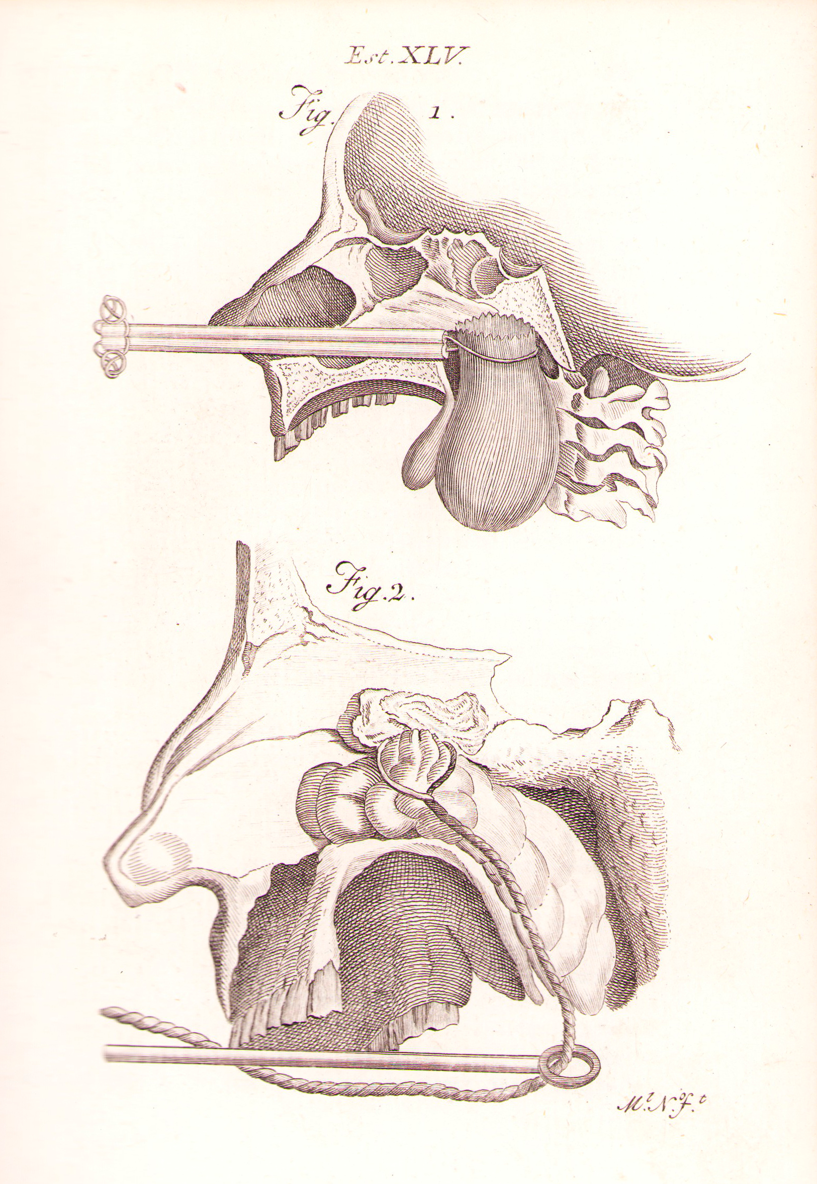 Lámina 45: Figura 1: Corte o sección de los huesos de la cabeza que representa un polipo. Figura 2: Pólipo de la nariz.