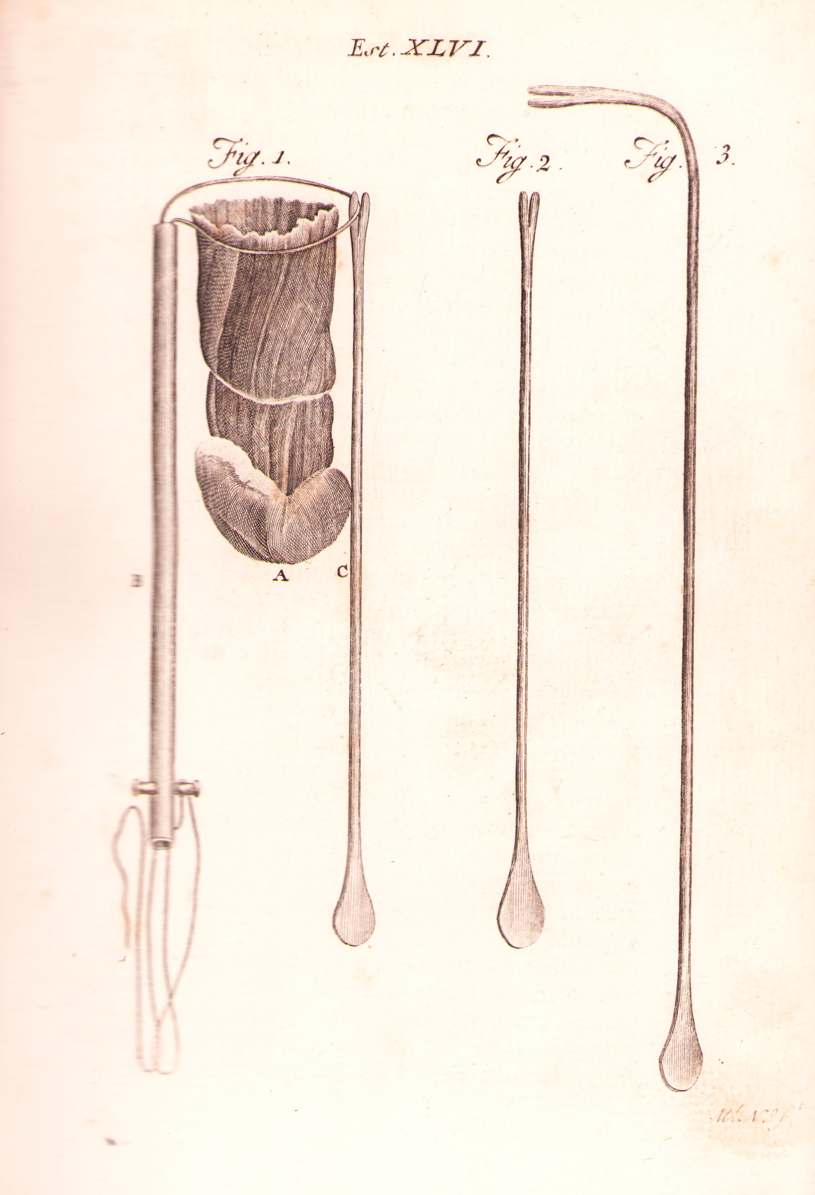 Lámina 46: Figura 1: Pólipo tan grande dilataba la ventana de la nariz. Figura 3:Tienta curva hundida que puede servir para aplicar una ligadura la nariz.