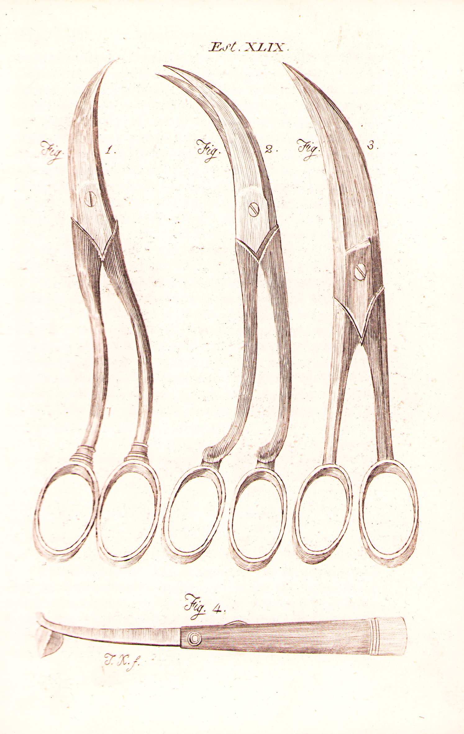 Lámina 49: Figura 1, 2 y 3: Diferentes formas de tijeras curvas para extirpar tumores de la boca.Figura 4: Instrumento muy parecido al Fleme para escarificar las encias de los niños.