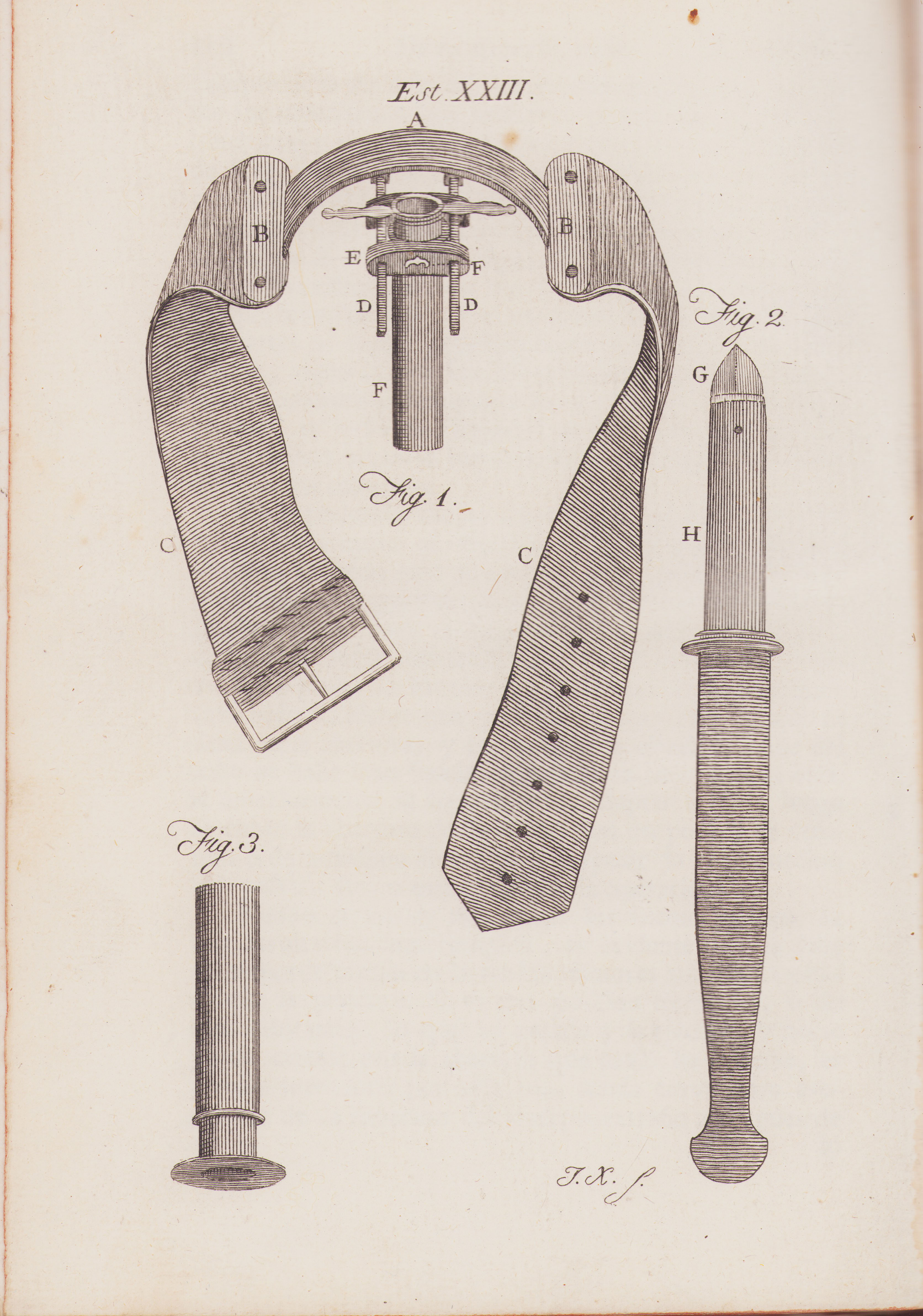Lámina 23: Figura 1: Instrumento para fijar la cándula después de la bronchotomía descrita en la página 205. Figura 2: El instrumento mencionado en la página 211, para abrir la trachea en la bronchotomia. Figura 3: La cándula doble separada del perforador.