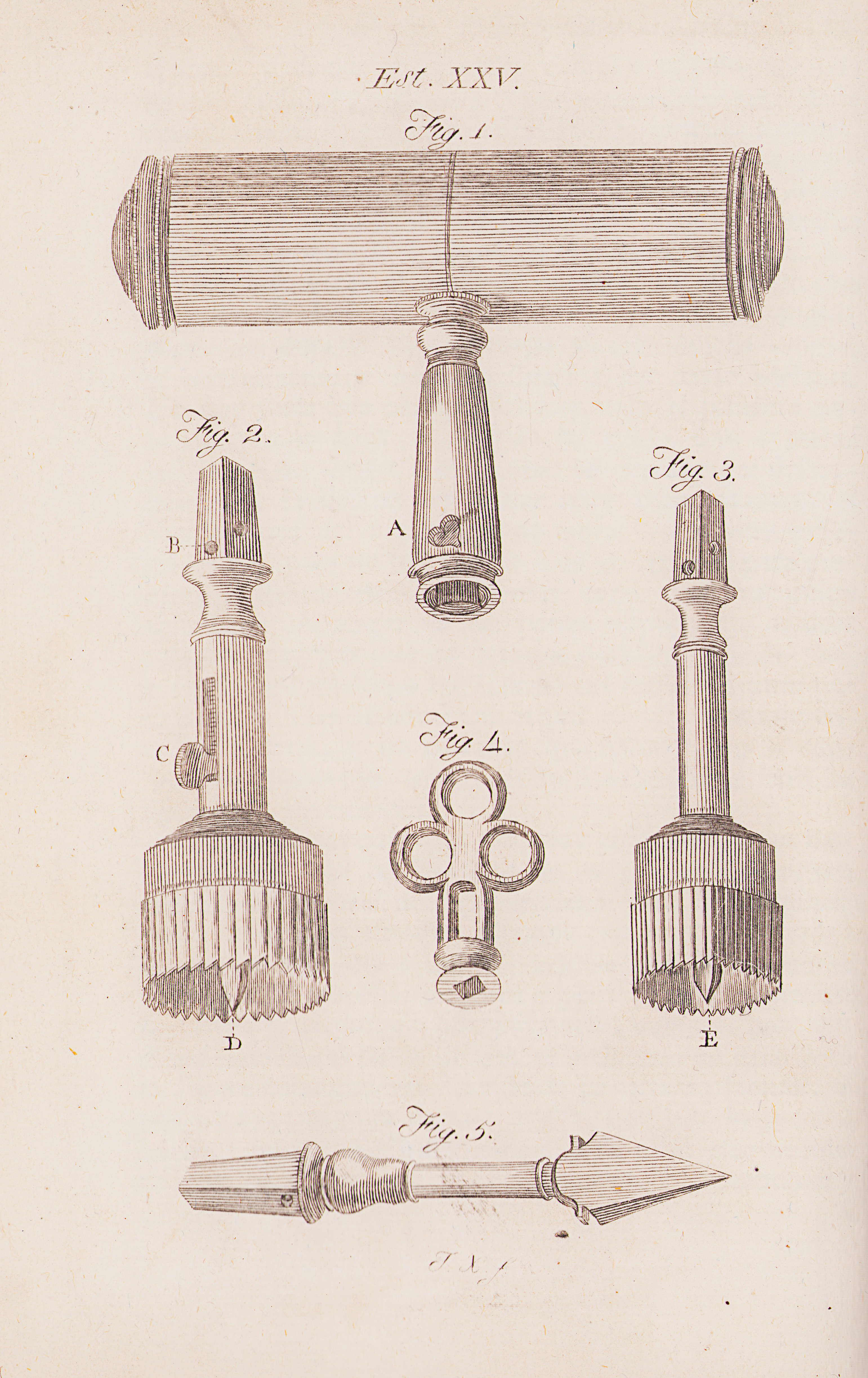 Lámina 25: Figura 1: Mango del trefine de acero.Figura 2: Dierra o corona del trefine. Figura 3: Corona más pequeña como la que se usa ordinariamente.