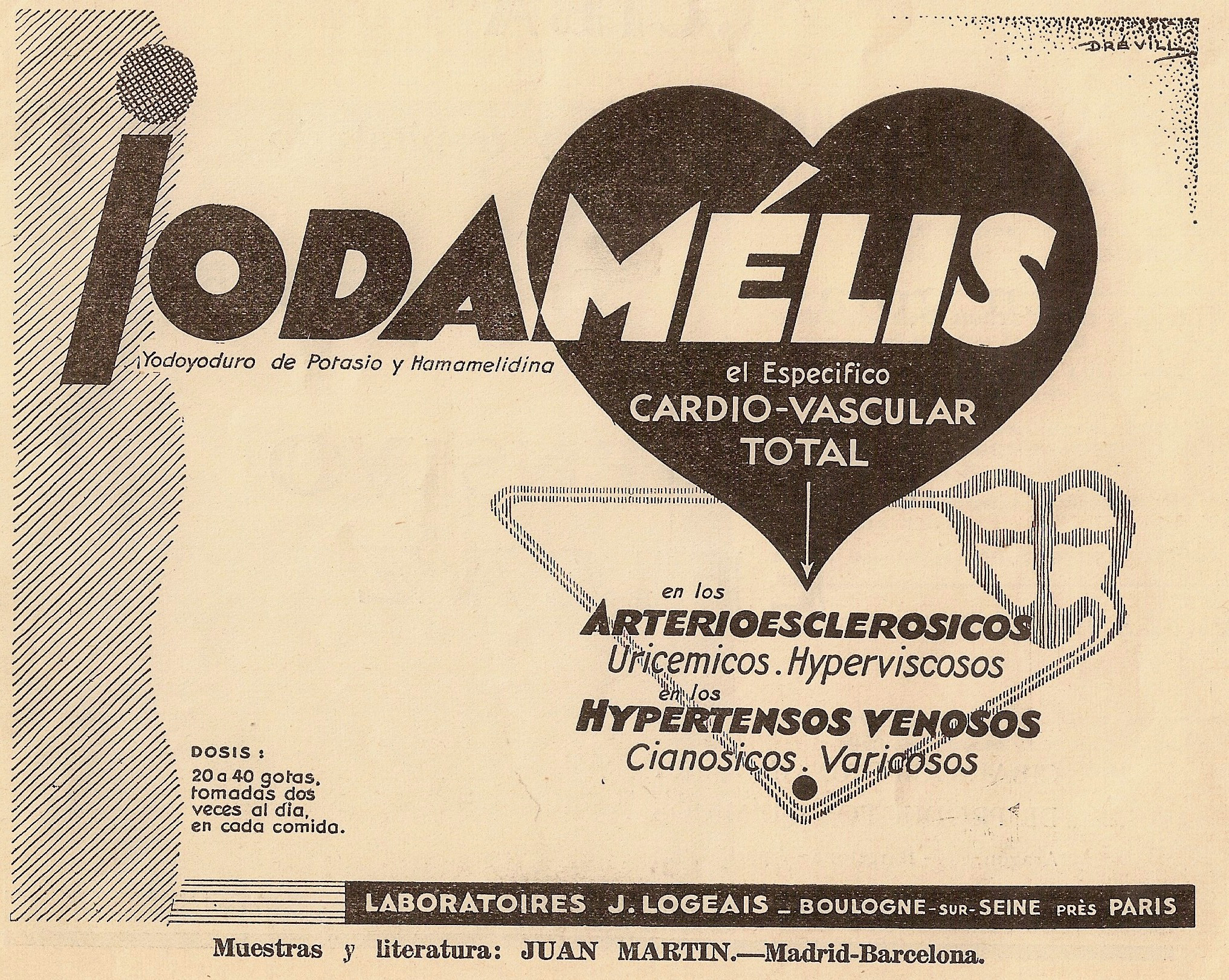 Iodamélis. Ioduro de potasio y hamamelidina. Laboratorios J. Logeais. Boulogne sur Seine. Archivos de Medicina, Cirugía y Especialidades. 9 de diciembre de 1933.