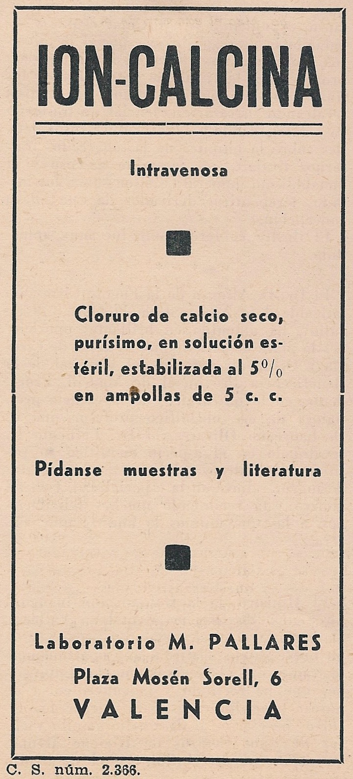 Ión-calcina. Cloruro de calcio. Ampollas. Intravenosa. Laboratorios M. Pallarés. Valencia. Publicidad aparecida en la revista Gaceta Médica Española. Año 18, número 1, 1944.