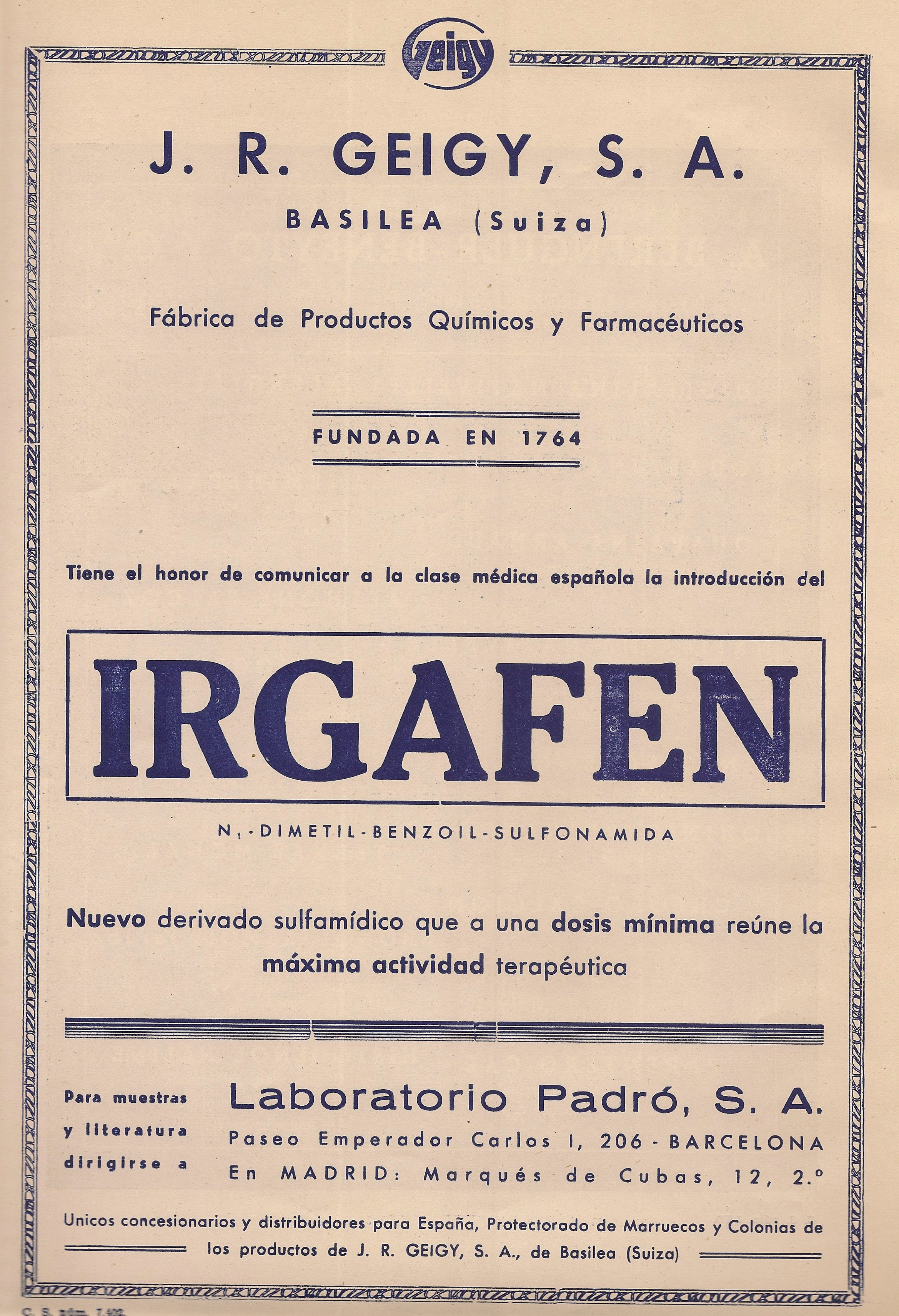 Irgafén. Devivado sulfamídico. J.R. Geygi S.A. Laboratorios Padró. Barcelona. Publicidad aparecida en la revista Gaceta Médica Española, año XIX, número 5. 1945.