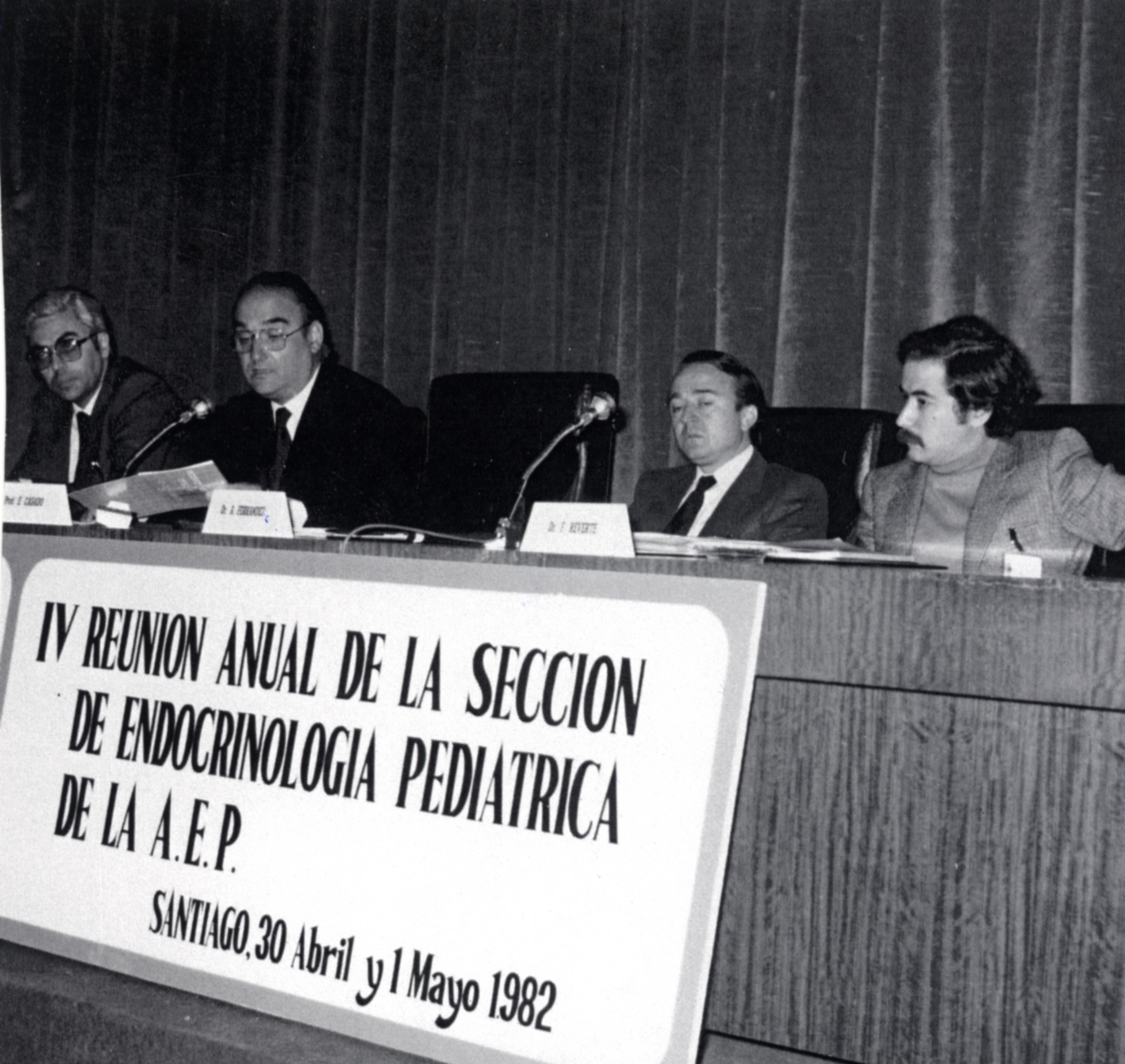 IV Reunión Anual de la Sección de Endocrinología Pediátrica de la Asociación Española de Pediatría, Santiago de Compostela, 1982. De izquierda a derecha: Dres. ?, Casado de Frías, A. Fernández Longás, G. Seara.