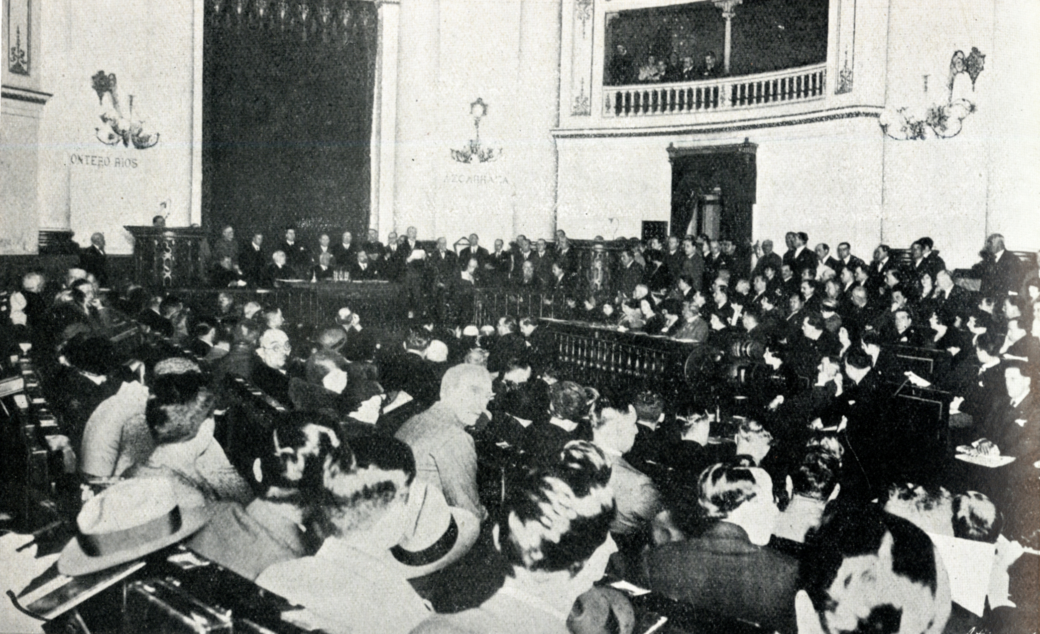 Aspecto parcial del salón de actos del Senado en la sesión de apertura, presidida por S. E. el señor Presidente de la República Española. Gaceta Médica Española, 67, Abr. 1932