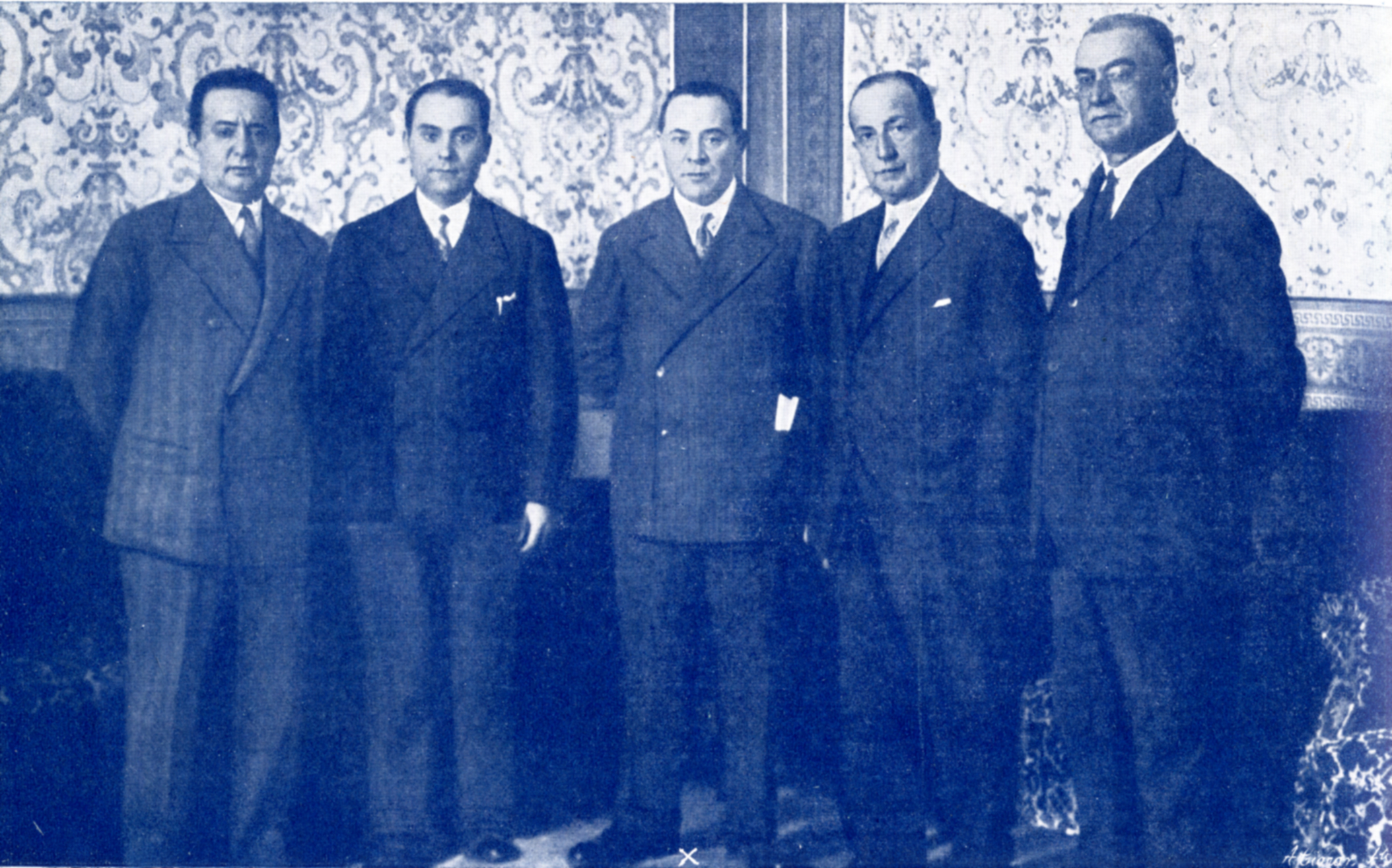 El doctor Juan Noguera (en el centro), después de pronunciar su conferencia sobre “Conocimientos metabólicos y patogénicos imprescindibles en el tratamiento de la diabetes”, acompañado del Decano de la Facultad de Medicina de Valencia, profesor Rodríguez Fornos, del Presidente y Secretario del Instituto, profesores Martín Pastor y Marco Navarro, y de su hermano, doctor Enrique Noguera.Gaceta Médica Española, 44, Jun. 1930