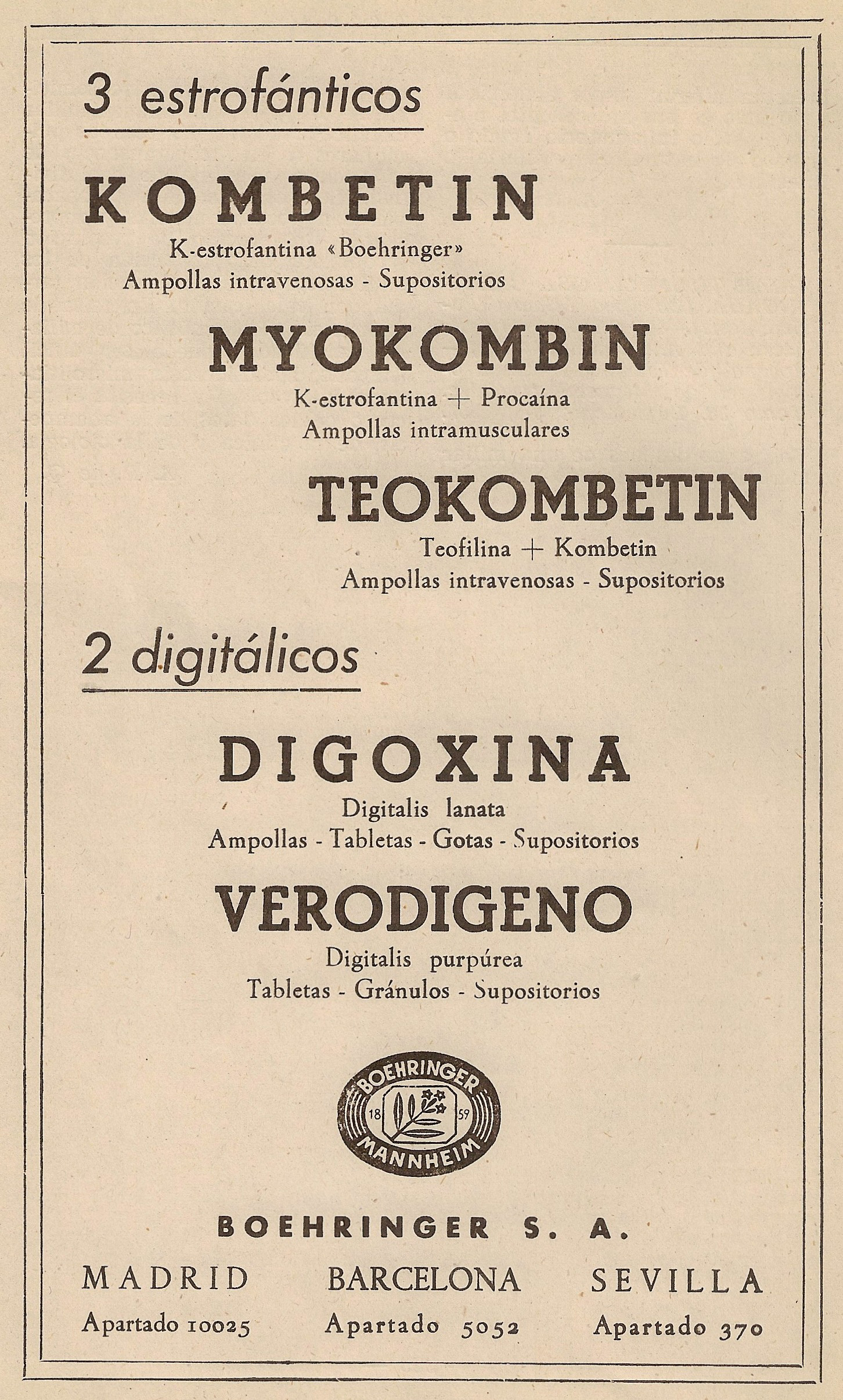 Kombetin, Myokombin, Teokombetin, Digoxina, Verodigeno. Tres farmacos estrofanticos y dos digitálicos. Boehringer, S.A., Madrid, Barcelona, Sevilla. Hispalis Médica, 1958.