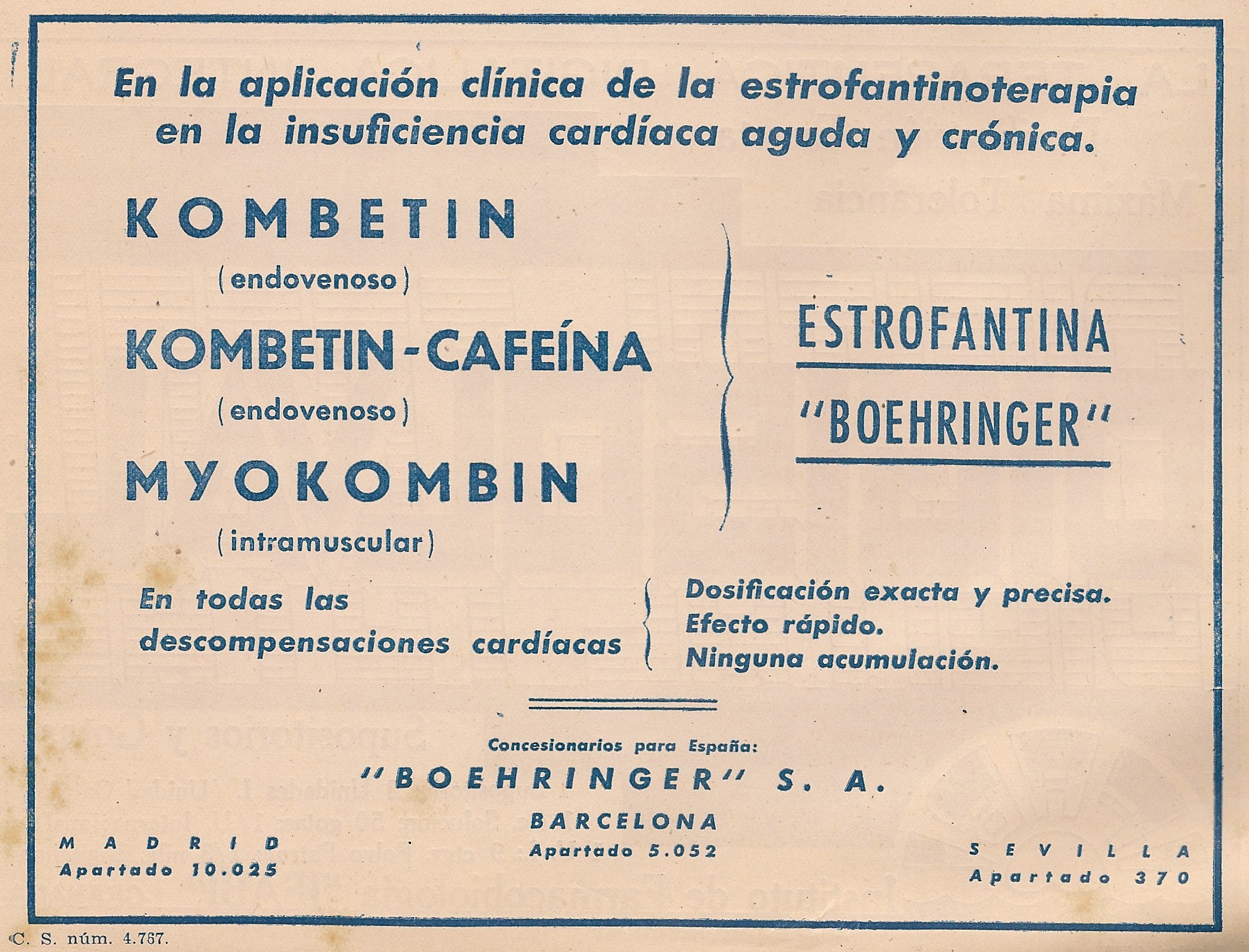 Kombetín. Endovenoso, intramuscular. Estrofantina. Descompensaciones cardiacas. Boehringer SA. Barcelona. Madrid, Sevilla. Publicidad aparecida en la revista Gaceta Médica Española. Año 18, número 1, 1944.