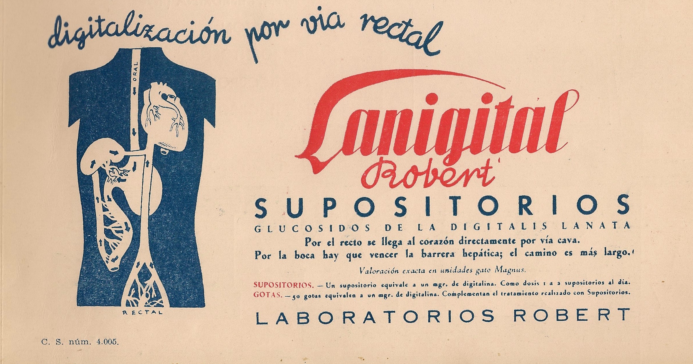 Lanigital Robert. Digitalina. Gotas, supositorios. Laboratorios Robert. Anuncio aparecido en la portada de la revista Gaceta Médica Española. Año 18, número 2, 1944.