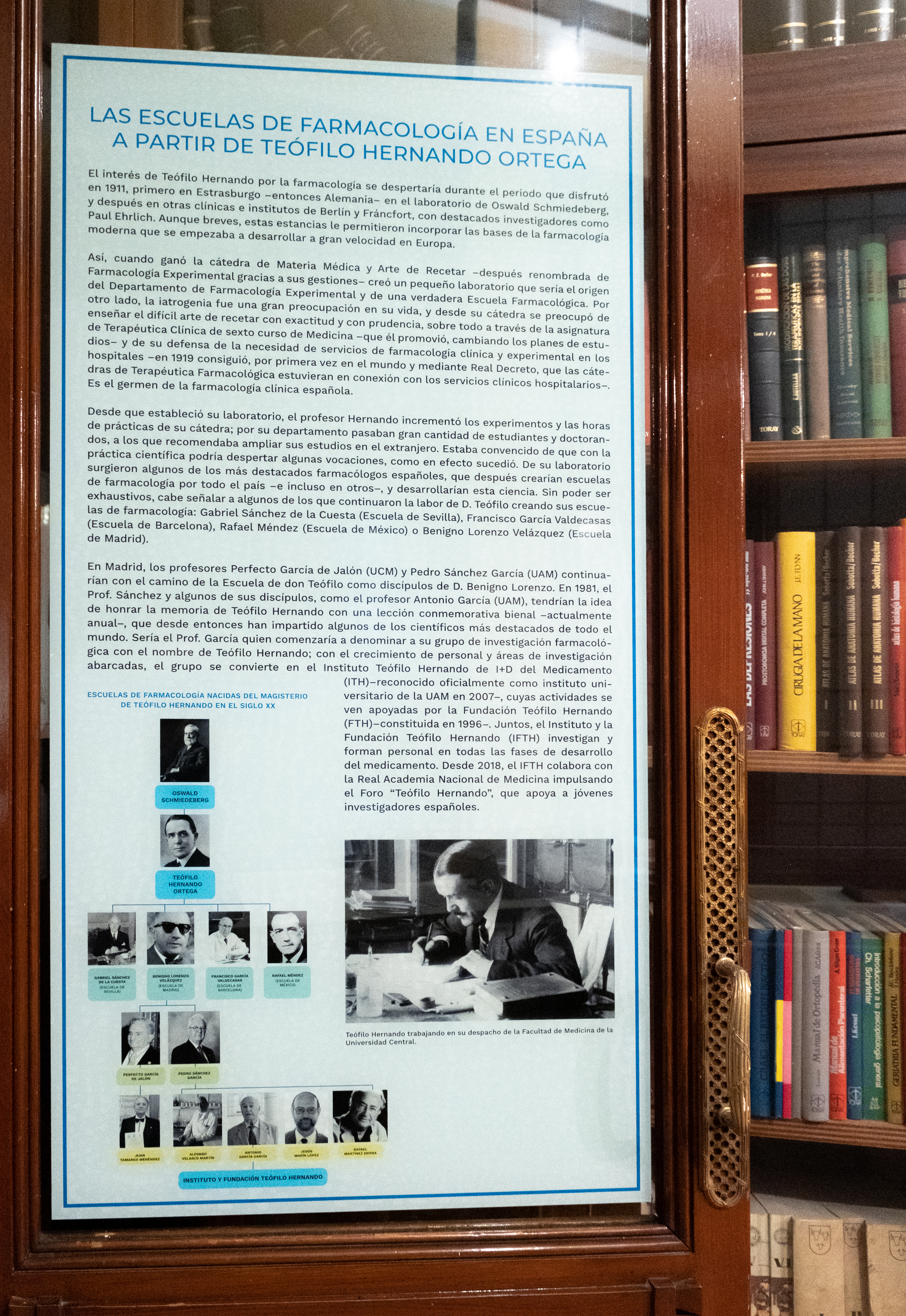 En Madrid, los profesores Perfecto García de Jalón (UCM) y Pedro Sánchez García (UAM) continua- rían con el camino de la Escuela de don Teófilo como discípulos de D. Benigno Lorenzo. En 1981, el Prof. Sánchez y algunos de sus discípulos, como el profesor Antonio García (UAM), tendrían la idea de honrar la memoria de Teófilo Hernando con una lección conmemorativa bienal -actualmente anual-, que desde entonces han impartido algunos de los científicos más destacados de todo el mundo. Sería el Prof. García quien comenzaría a denominar a su grupo de investigación farmacoló- gica con el nombre de Teófilo Hernando; con el crecimiento de personal y áreas de investigación abarcadas. el grupo se convierte en el Instituto Teófilo Hernando de I+D del Medicamento (ITH)-reconocido oficialmente como instituto uni- versitario de la UAM en 2007-, cuyas actividades se ven apoyadas por la Fundación Teófilo Hernando (FTH)-constituida en 1996-. Juntos, el Instituto y la Fundación Teófilo Hernando (IFTH) investigan y forman personal en todas las fases de desarrollo del medicamento. Desde 2018, el IFTH colabora con la Real Academia Nacional de Medicina impulsando el Foro “Teófilo Hernando”, que apoya a jóvenes investigadores españoles.