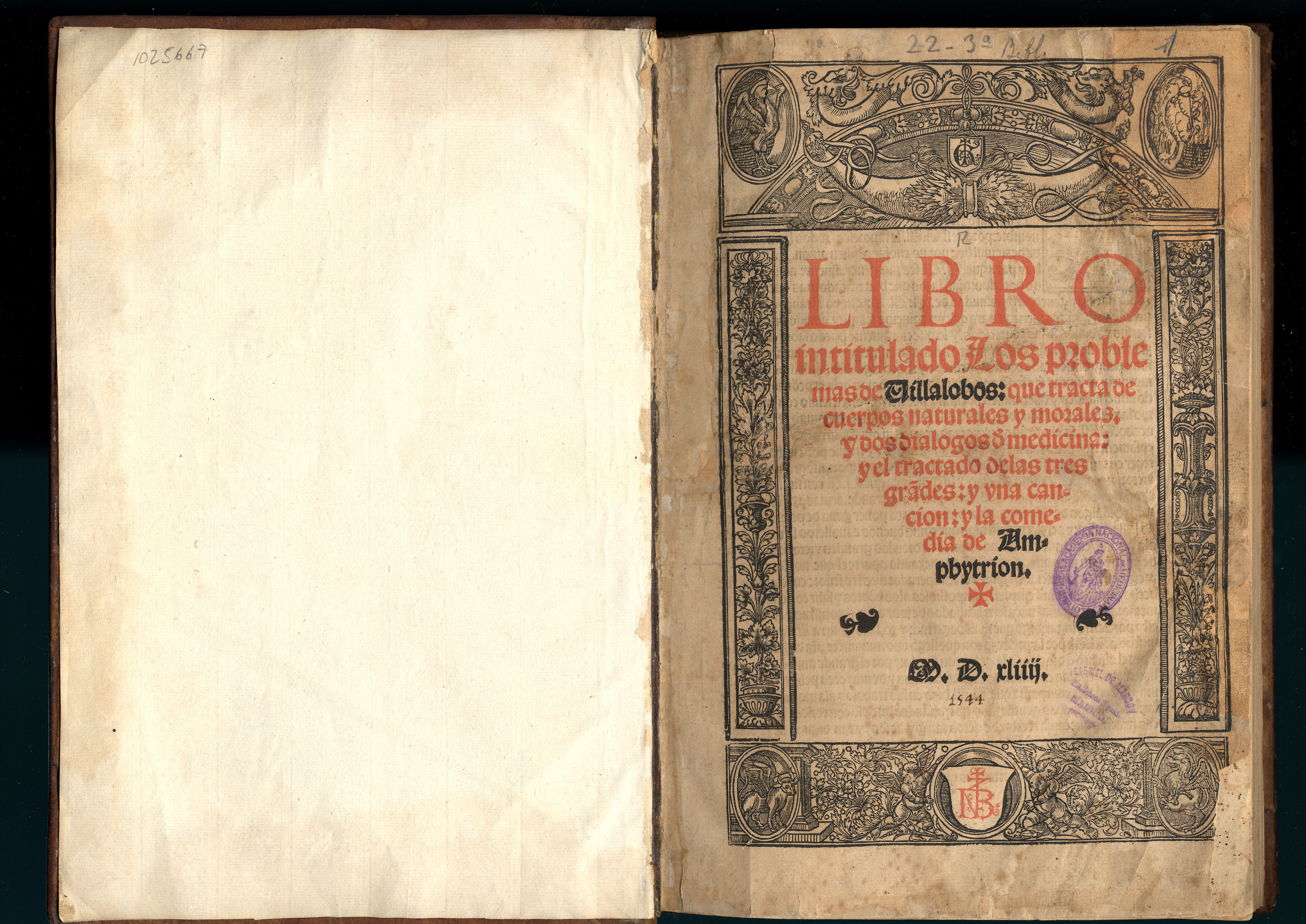 Libro intitulado Los Problemas de Villalobos, que tracta de cuerpos naturales y morales; y dos diálogos de medicina: y el tractado de las tres grandes: y una canción, y la comedia de Amphitrion.