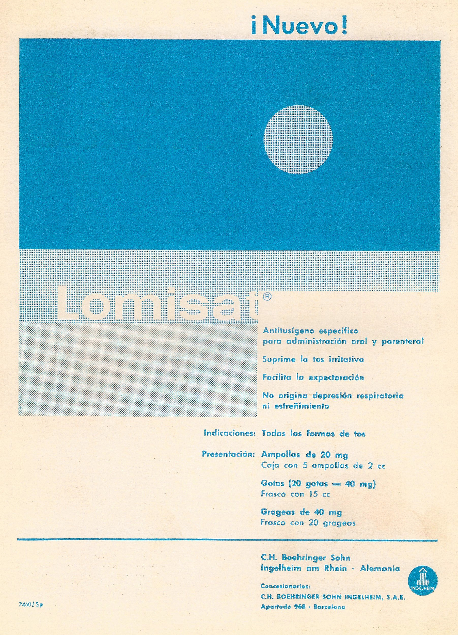Lomisat. Antitusígeno. C.H. Boehringer Sohn. Alemania. Archivos de la Facultad de Medicina de Madrid, 1962.