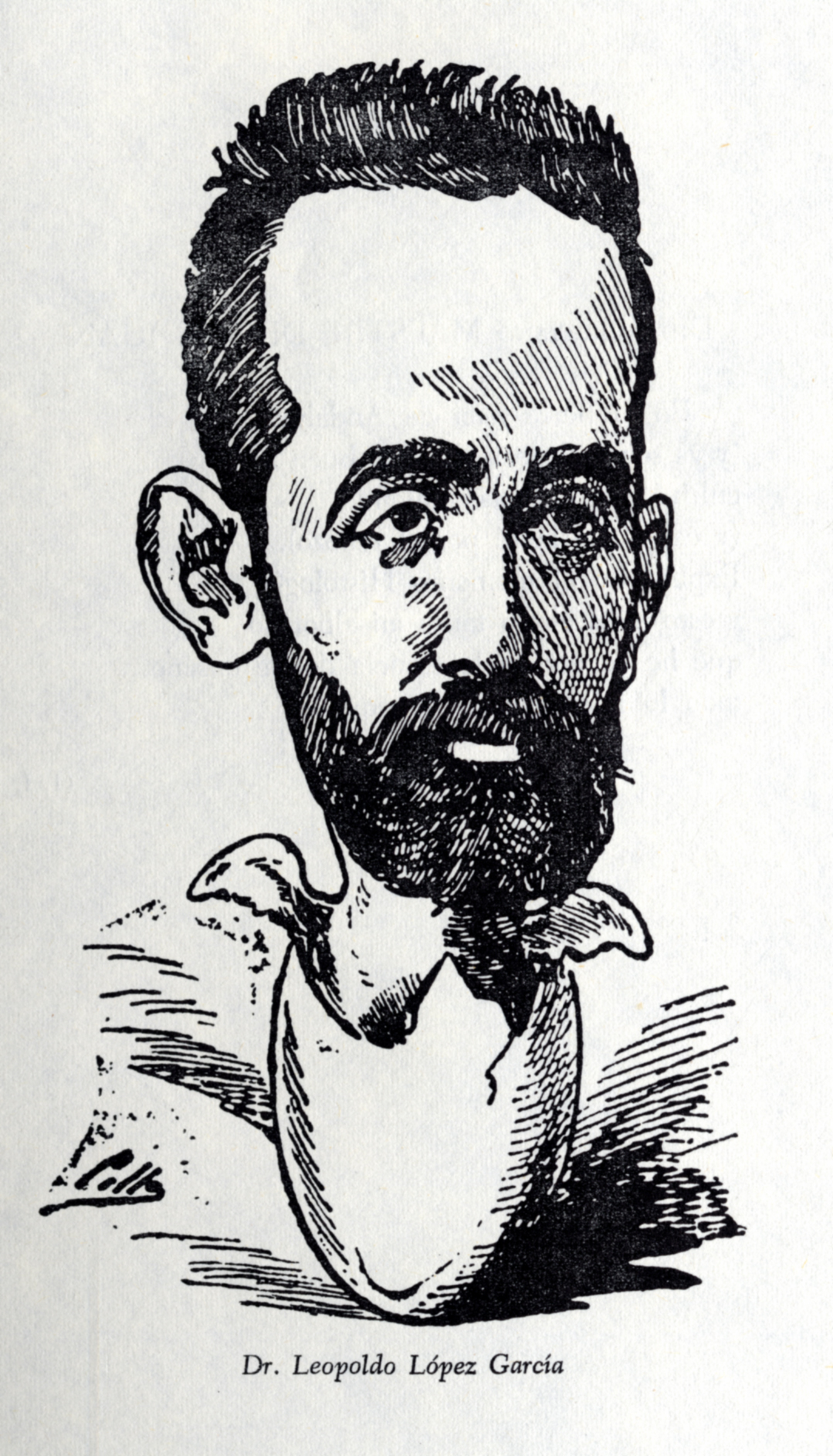 Caricatura del Dr. D. Leopoldo López García (1854 v- 1932), por Cilla, sacada del libro del Prof. D. Luís Sánchez Granjel, ‘Biografía de “El Dr. Sangredo” (1883-1884)’, que fue una revista médica del siglo XIX que se subtitulaba “Revista satírica quincenal. Dedicada a los hijos de Esculapio”. Pag. 97.