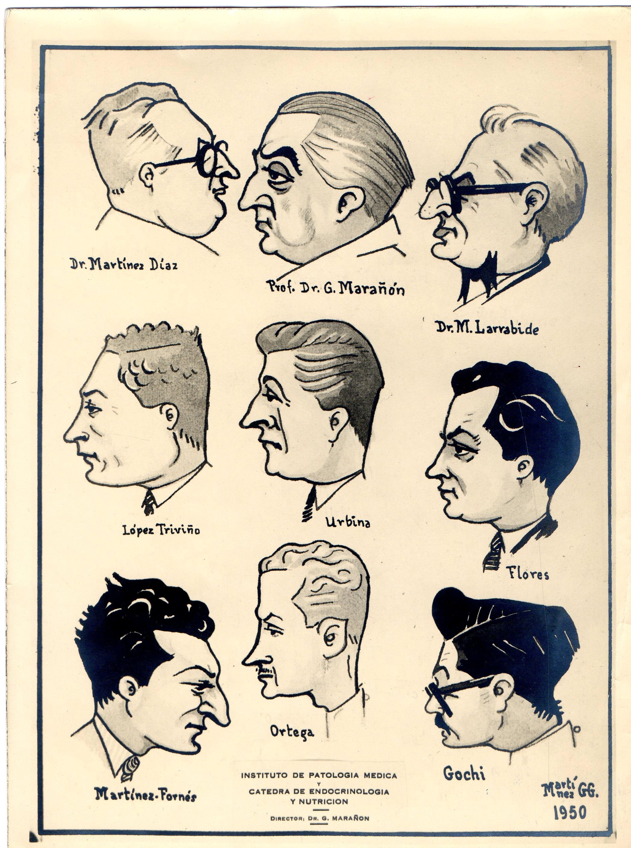 Gregorio Marañón y sus claboradotes en el Instituto de Patología Médica. Hospital Provincial de Madrid. Caricaturas de Gómez Gordo
