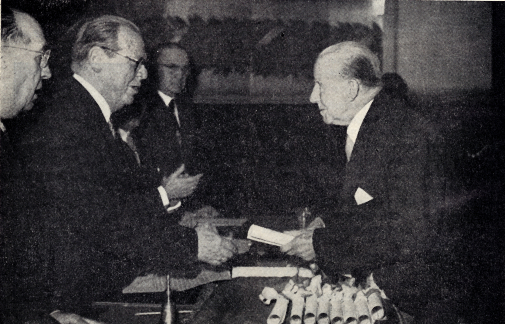 El Profesor Manuel Marín Amat, recibiendo de manos del Prof. Palanca el Premio Couder que le fue concedido por la Real Academia Nacional de Medicina, durante la Solemne Sesión Inaugural del curso Académico de 1960.