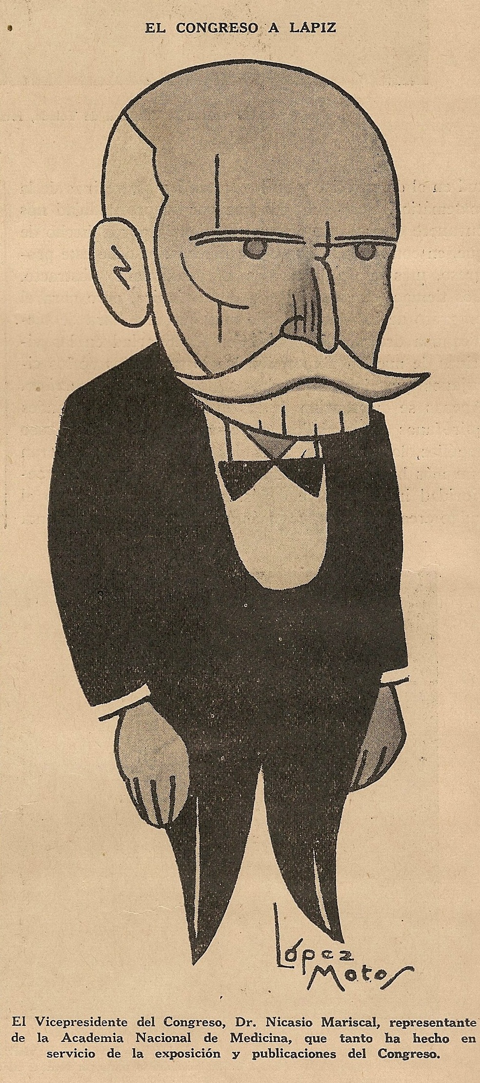 Mariscal y García de Rello, Nicasio. Congreso Internacional de Historia de la Medicina. Madrid. El Siglo Médico, 1935. Caricatura Lopez Motos