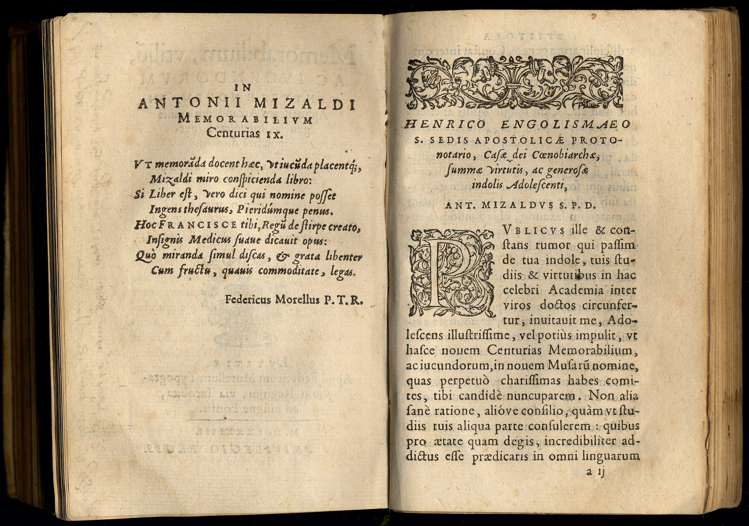 MIZAULD, Antoine (1510-1578). — Memorabilium, utilium ac iucundorum centuriae novem… — Lutetiae : apud Federicum Morellum, 1574. — [16], 132 h. ; 8º [17 cm.]. – Perg.