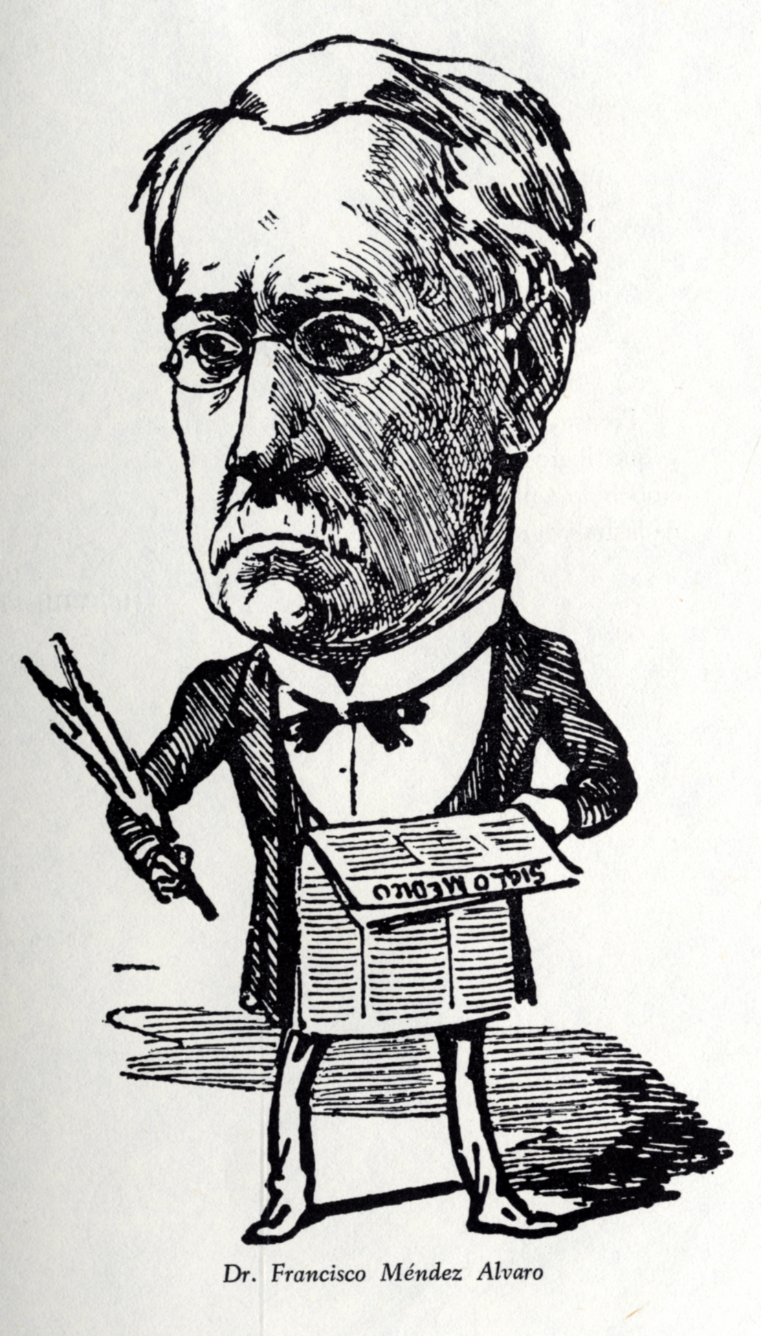 Caricatura del Dr. D.Francisco Méndez Alvaro, por Cilla (1806 – 1883), sacada del libro del Prof. D. Luís Sánchez Granjel, ‘Biografía de “El Dr. Sangredo” (1883-1884)’, que fue una revista médica del siglo XIX que se subtitulaba “Revista satírica quincenal. Dedicada a los hijos de Esculapio”. Pag. 107.