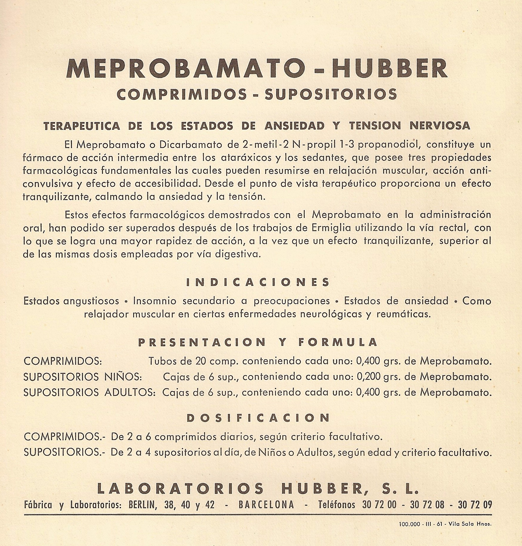 Meprobamato-Hubber. Encarte en Archivos de la Facultad de Medicina de Madrid, 1962.