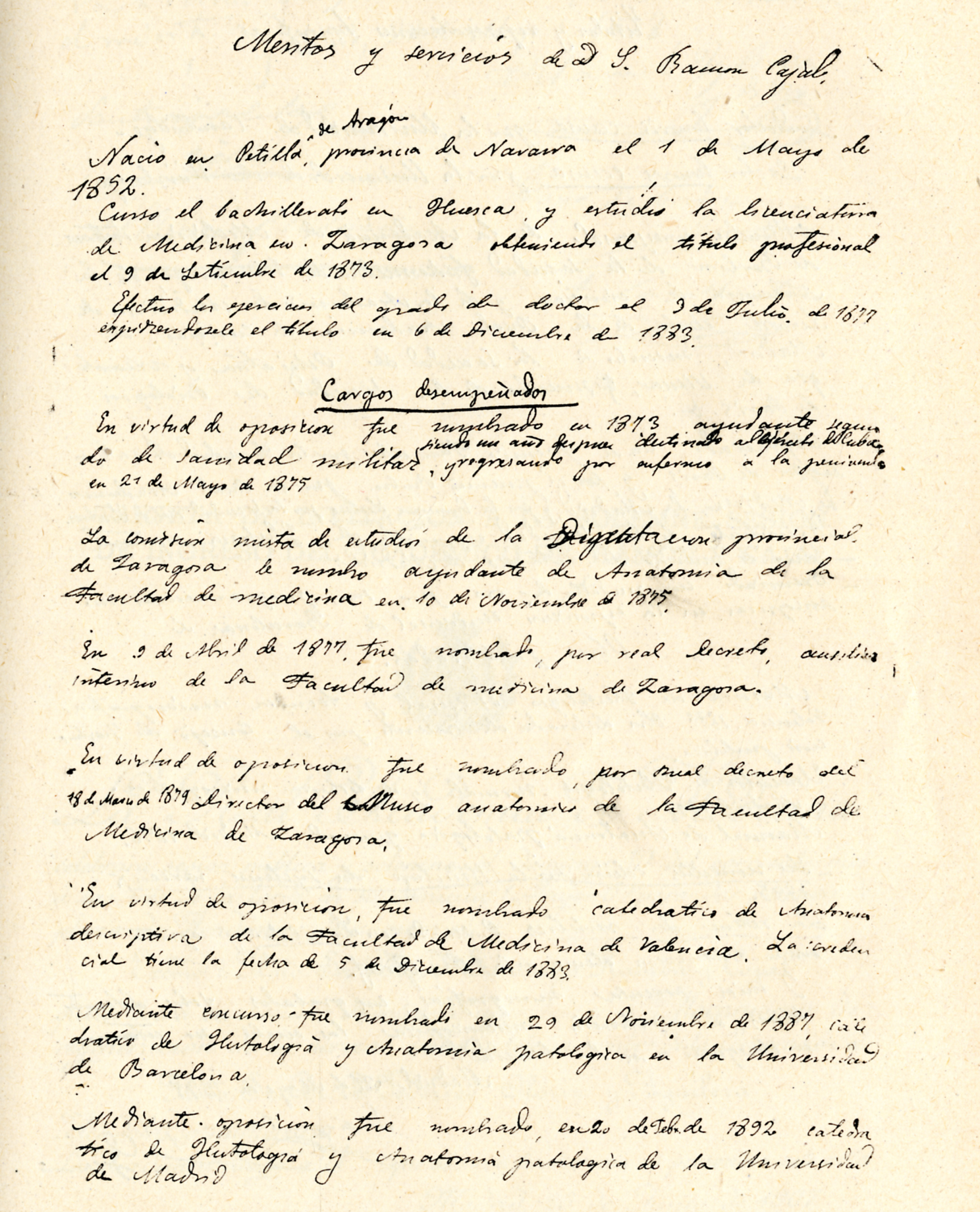 Relación de méritos presentados a la Real Academia Nacional de Medicina por D. Santiago Ramón y Cajal para optar a la plaza vacante en la Sección de Anatomía y Fisiología, redactados de su puño y letra (1ª parte).