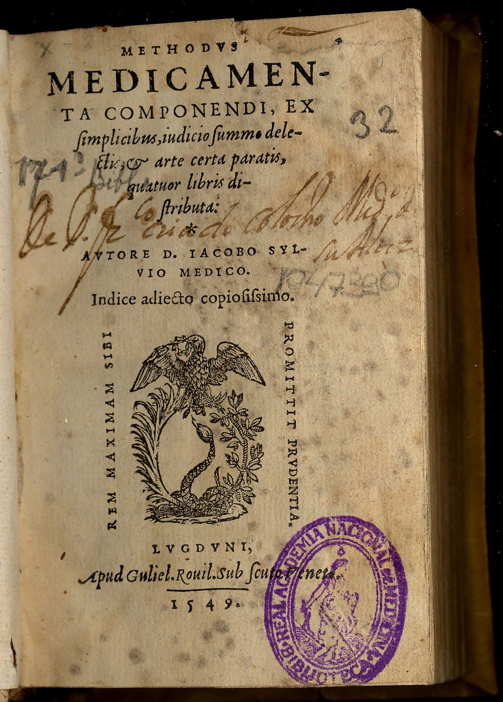 DU BOIS, Jacques (1478-1555). – Methodo medicamenta componendi. – Lugduni : apud Guliel. Rovil., 1549. — 689, [20] p. ; 12º (13 cm). – Perg.