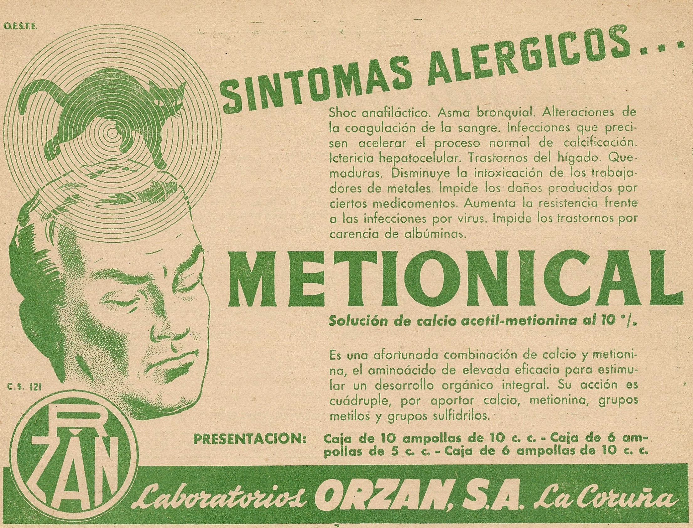 Metionical. Síntomas alérgicos. Solución de calcio acetil-metionina. Laboratorios Orzán S.A. La Coruña. Publicidad aparecida en Gaceta Médica Española. Noviembre 1953, año XXVII, número 11.