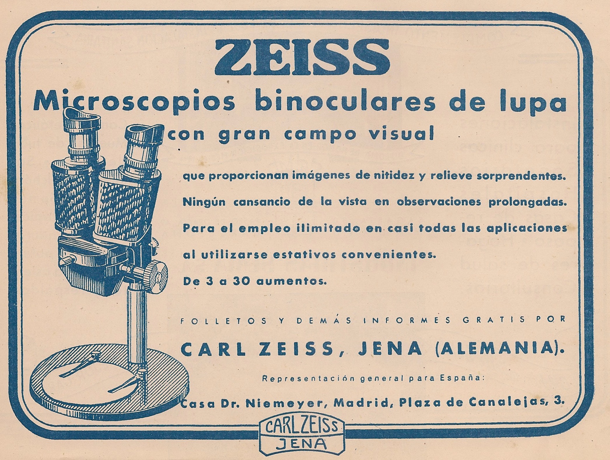 Microscopios binoculares de lupa. Carl Zeiss. Jena. Casa Dr. Niemeyer. Madrid. Publicidad aparecida en la revista Gaceta Médica Española. Año 18, número 1, 1944.