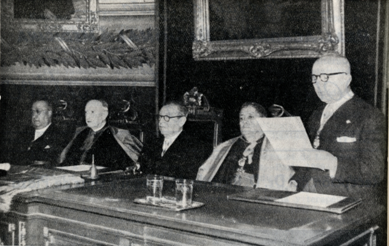 Mesa presidencial del acto de recepción del Excmo. Sr. D. Ricardo Montequi y Díaz de Plaza como Académico de Número de la Real Academia Nacional de Medicina. De derecha a izquierda, Prof. Matilla, Secretario Perpetuo de la Corporación, leyendo el acta de nombramiento, el Excmo. Sr. arzobispo de Sión, Dr. Muñoyerro, el Presidente de la Academia, Prof. Palanca, el Excmo. Sr. Obispo de Madrid-Alcalá, D. Leopoldo Eijo Garay, y el Vicepresidente de la Academia, Prof. Carro.