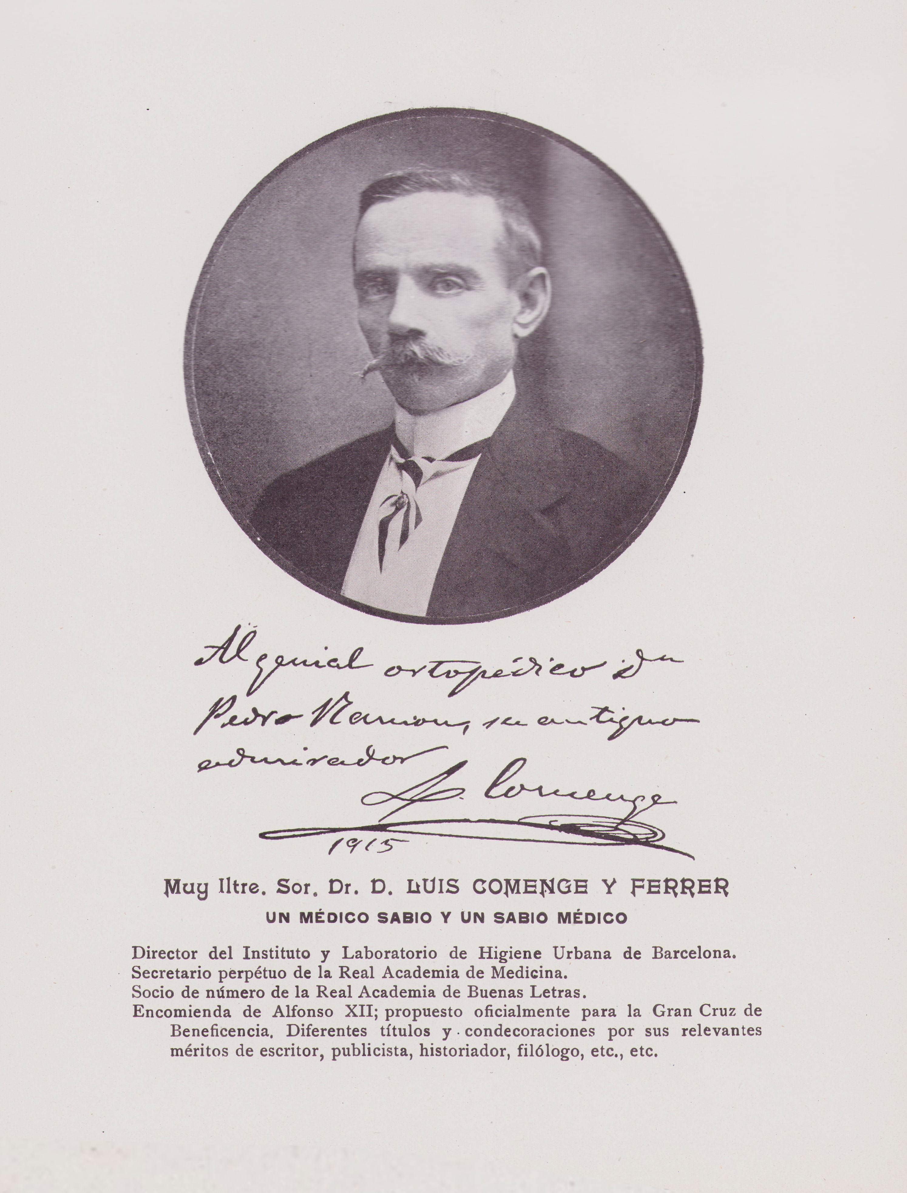 Director del Instituto y Laboratorio de Higiene Urbana de Barcelona. Secretario perpétuo de la Real Academia de Medicina. Socio de número de la Real Academia de Buenas Letras. Encomienda de Alfonso XII; propuesto oficialmente para la Gran Cruz de Beneficencia. Diferentes títulos y condecoraciones por sus relevantes méritos de escritor, publicista, historiador, filologo, etc., etc.
