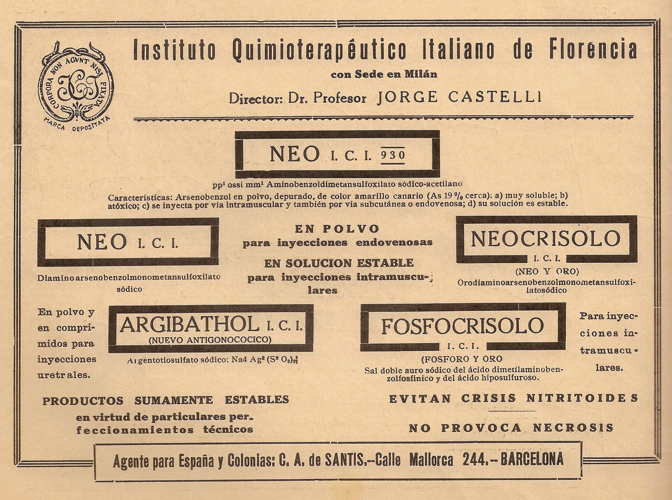 Neocrisolo, Argibathol, Fosfocrisolo. Instituto Quimioterapéutico Italiano de Florencia. Archivos de Medicina, Cirugía y Especialidades, 7 de julio de 1934.