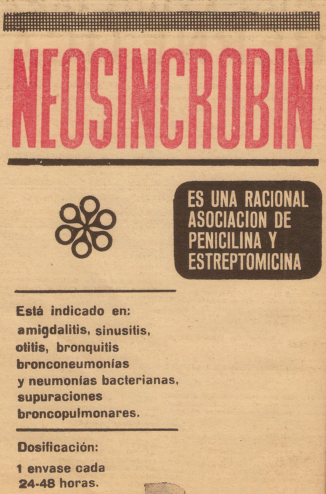 Neosincrobin. Asociación de penicilina y estreptomicina. Amigdalitis, sinusitis, otitis, bronquitis, bronconeumonías y neumonias bacterianas. Tribuna Médica, 6 de enero de 1967 .Publicado por Antibioticos, S.A.
