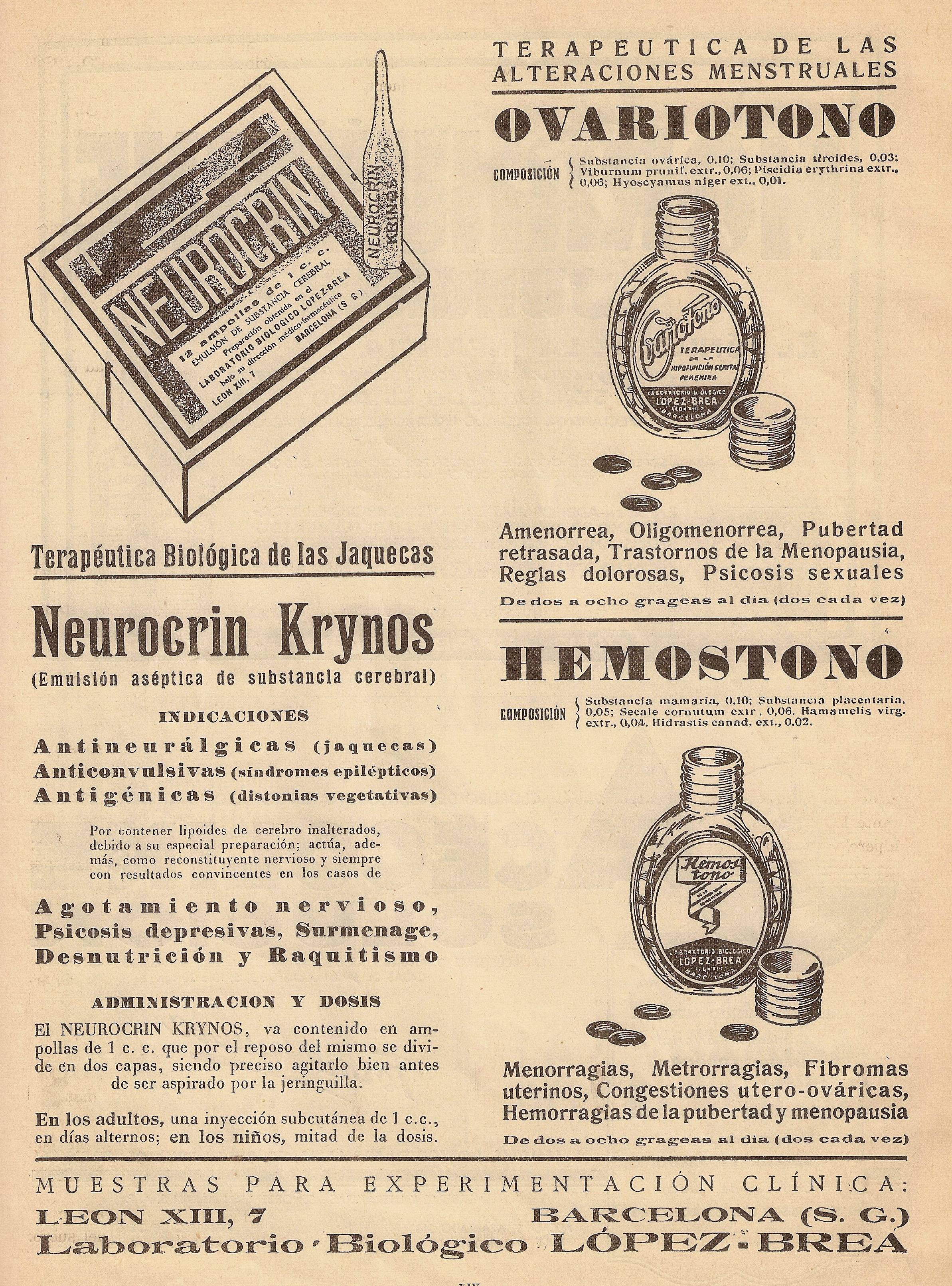 Neurocrin Krynos, Ovariotono, Hemostono. Laboratorio Biológico López-Brea. Barcelona. Archivos de Medicina, Cirugía y Especialidades. 9 de diciembre de 1933.