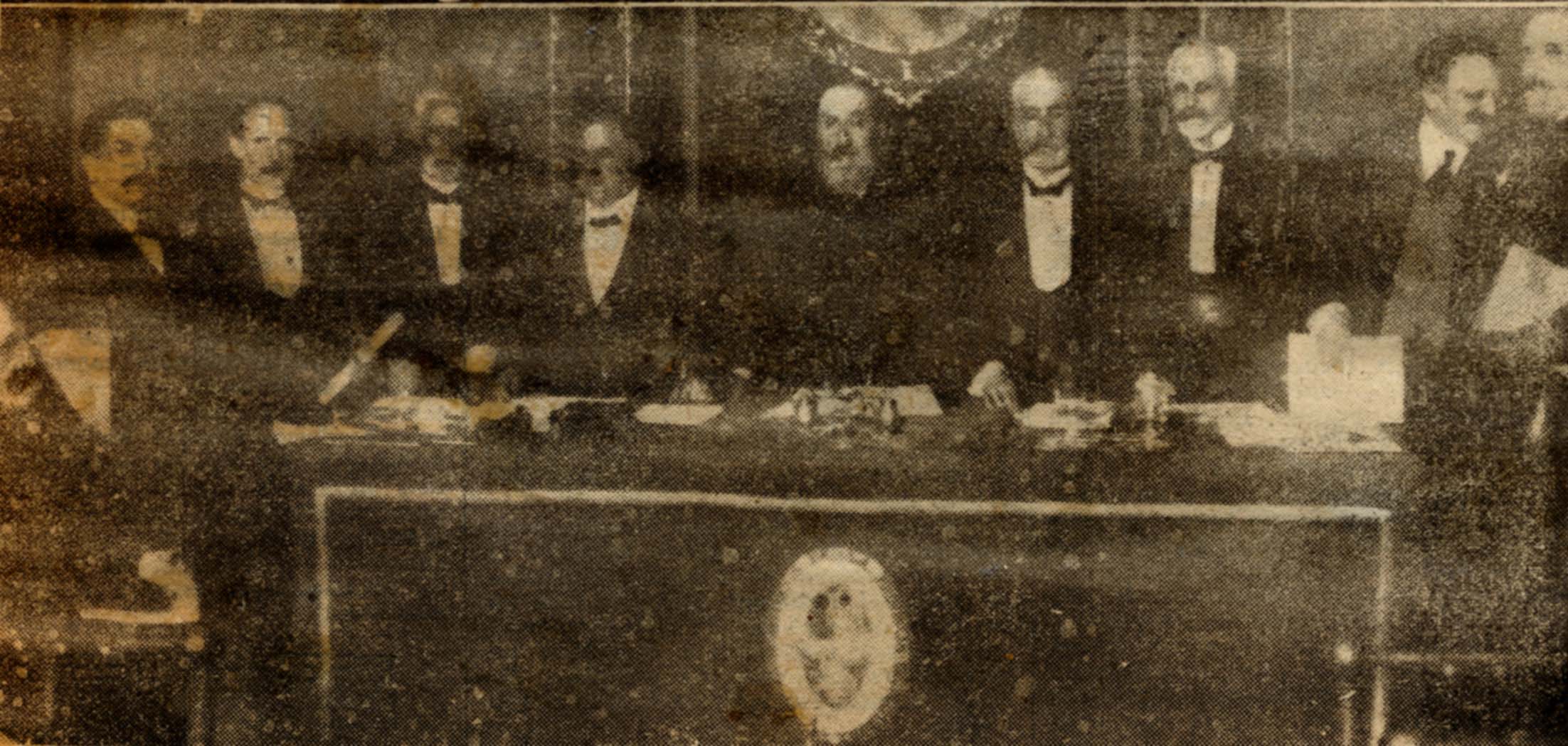 Mesa presidencial del acto de Toma de Posesión del Dr. Nicasio Mariscal como nuevo Académico de Número de la Real Academia Nacional de Medicina. El acto tuvo lugar en el Colegio de Médicos de Madrid bajo la presidencia del Marques de Vadillo, Ministro de Gracia y Justicia. La contestación por parte de la Corporación corrió a cargo del Profesor Angel Pulido.