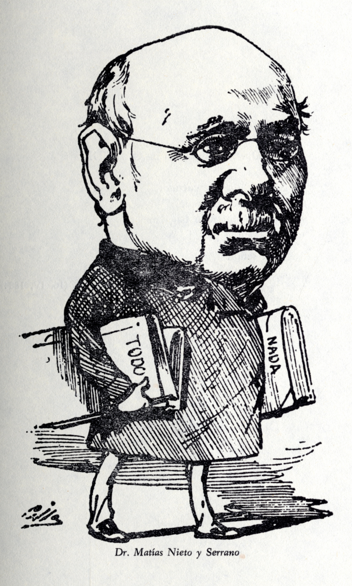 Caricatura del Dr. D. Matías Nieto y Serrano (1813 – 1902), marqués de Guadalerzas , por Cilla, sacada del libro del Prof. D. Luís Sánchez Granjel, ‘Biografía de “El Dr. Sangredo” (1883-1884)’, que fue una revista médica del siglo XIX que se subtitulaba “Revista satírica quincenal. Dedicada a los hijos de Esculapio”. Pag. 111.