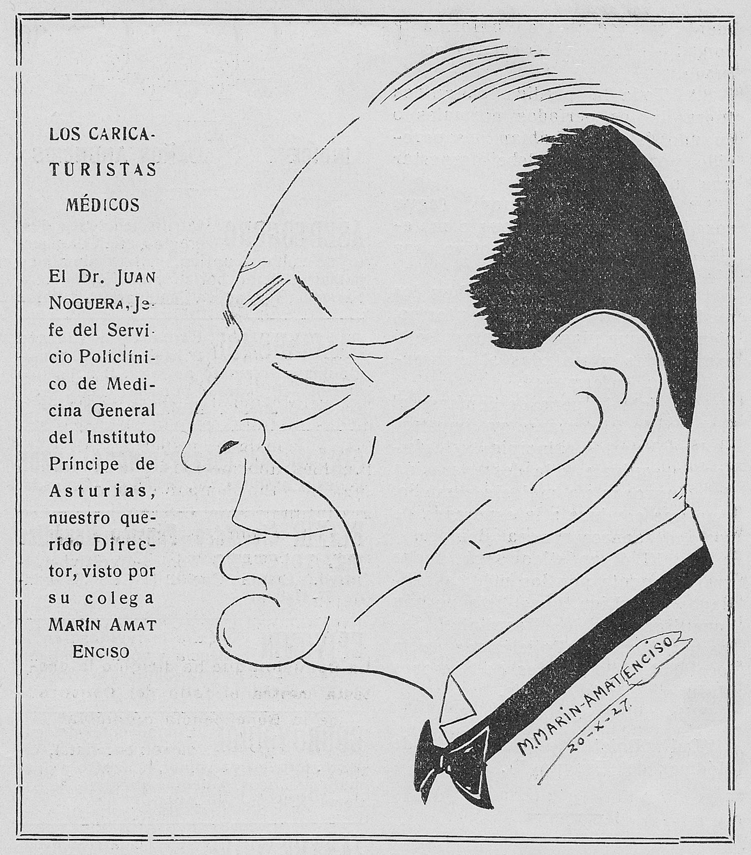 Noguera, Juan. Jefe Servicio Policlínico Medicina General Instituto Principe de Asturias. Caricatura del Dr. Marin Amat Enciso. Gaceta Medica Española, Nov. 1927
