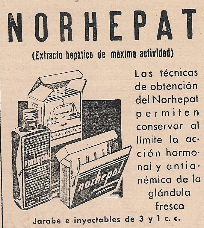 Norhepat. Extracto hepático. Jarabe, inyectable. Anuncio aparecido en la portada de la revista Gaceta Médica Española. Año 18, número 2, 1944