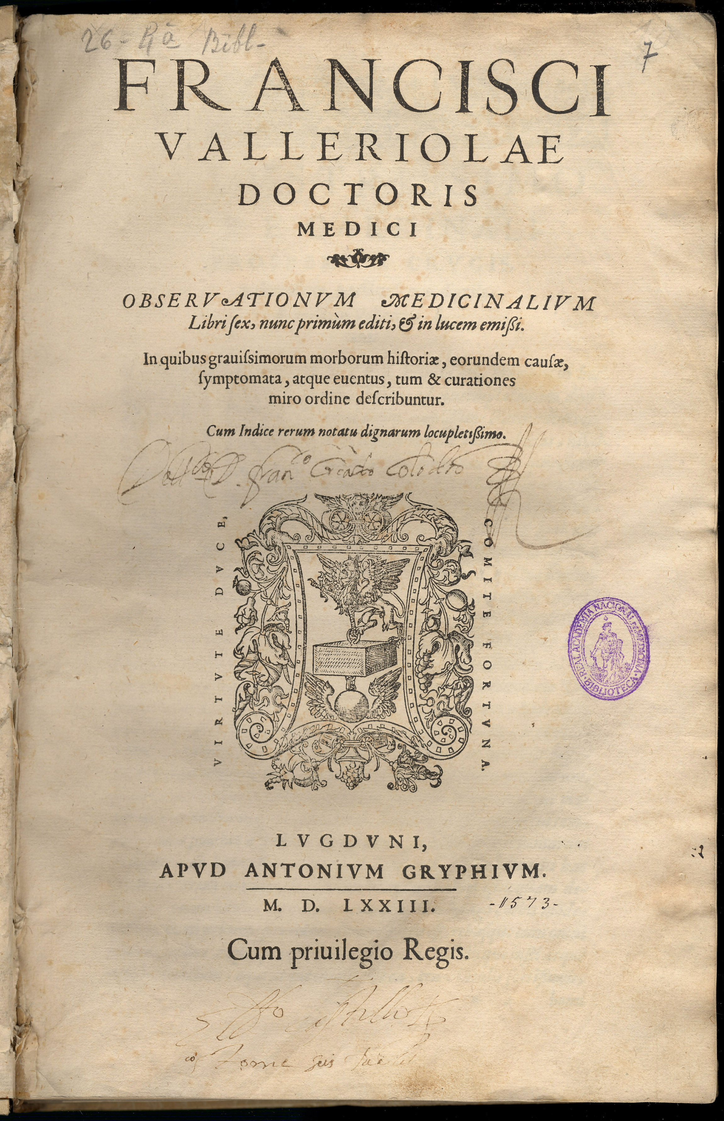VALLERIOLA, Francisco (1504-1580). – Observationum medicinalium libri sex… – Lugduni : apud Antonium Gryphium, 1573. – [17], 264, [20] p. ; fol. (34 cm). – Perg.
