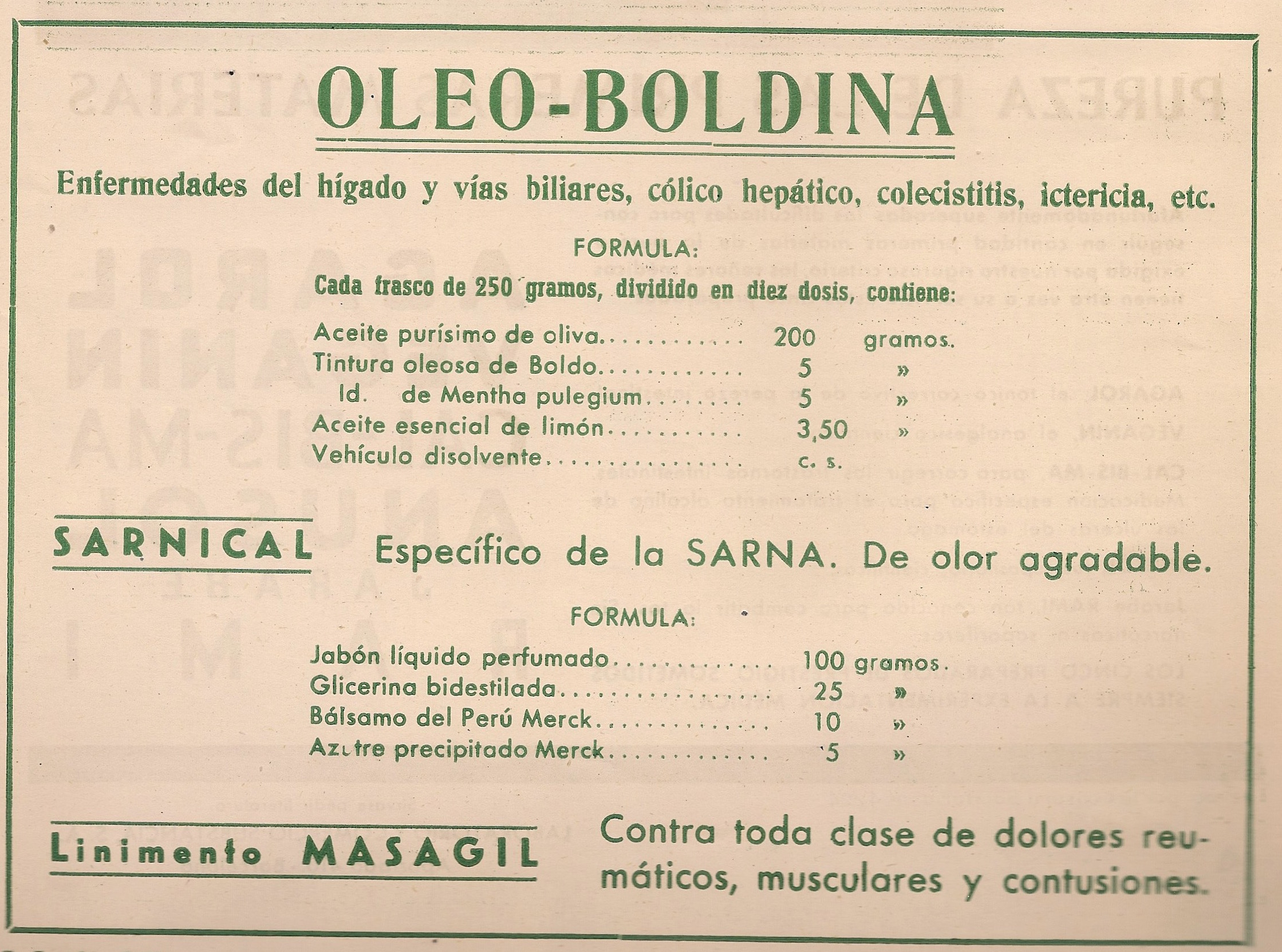 Oleo-Boldina. Aceite de oliva, tintura oleosa de Boldo, menta, aceite esencial de limón. Publicidad aparecida en la revista Gaceta Médica Española, año XIX, número 5. 1945.